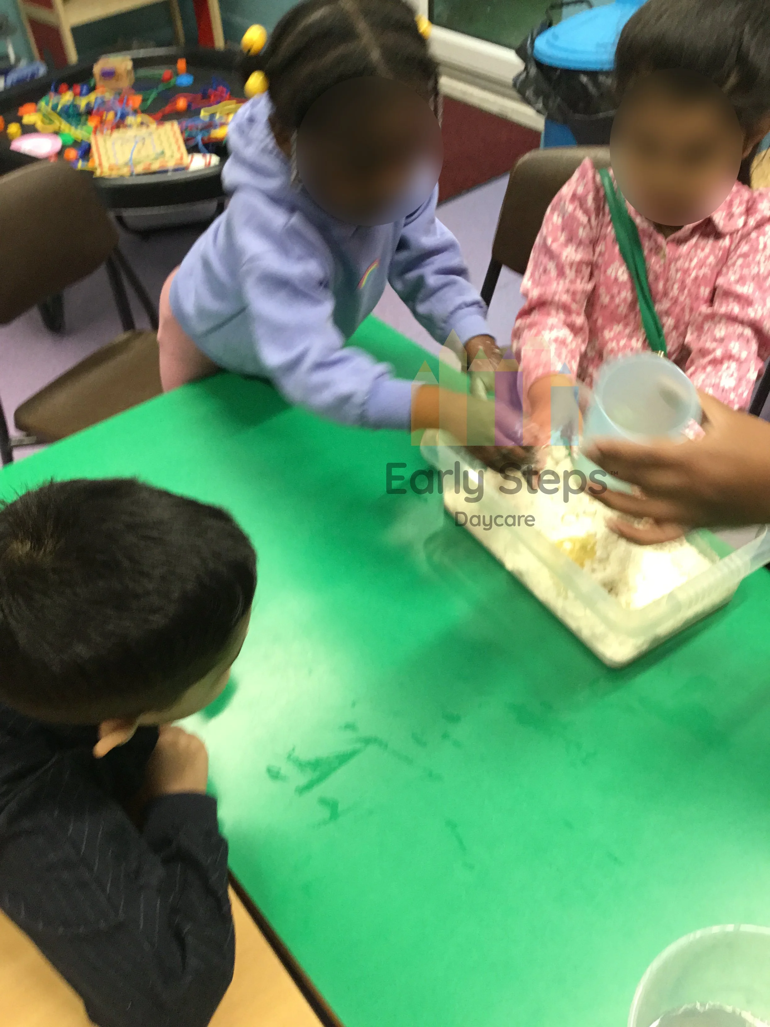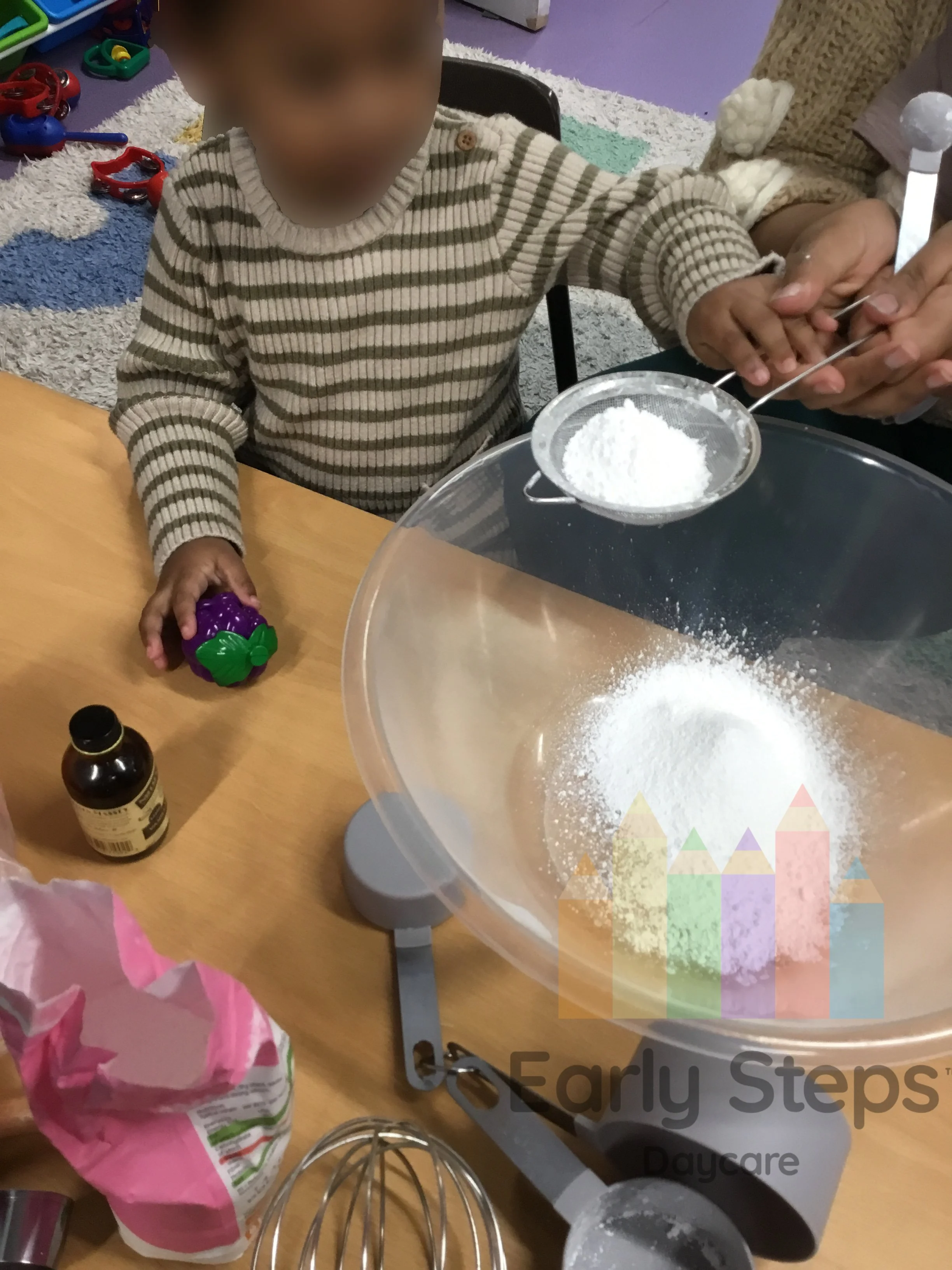 Listening carefully and following steps to make playdough – building language, sequencing, and hands-on learning in EYFS.