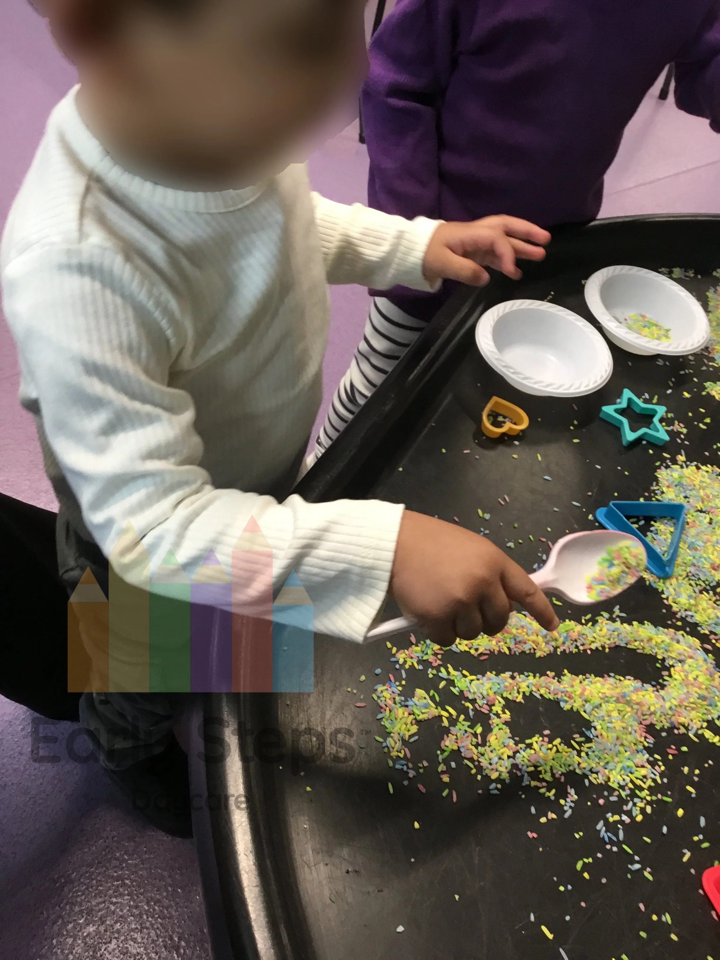 Talking about colours, textures, and patterns while sorting rice – encouraging descriptive language and vocabulary in EYFS.