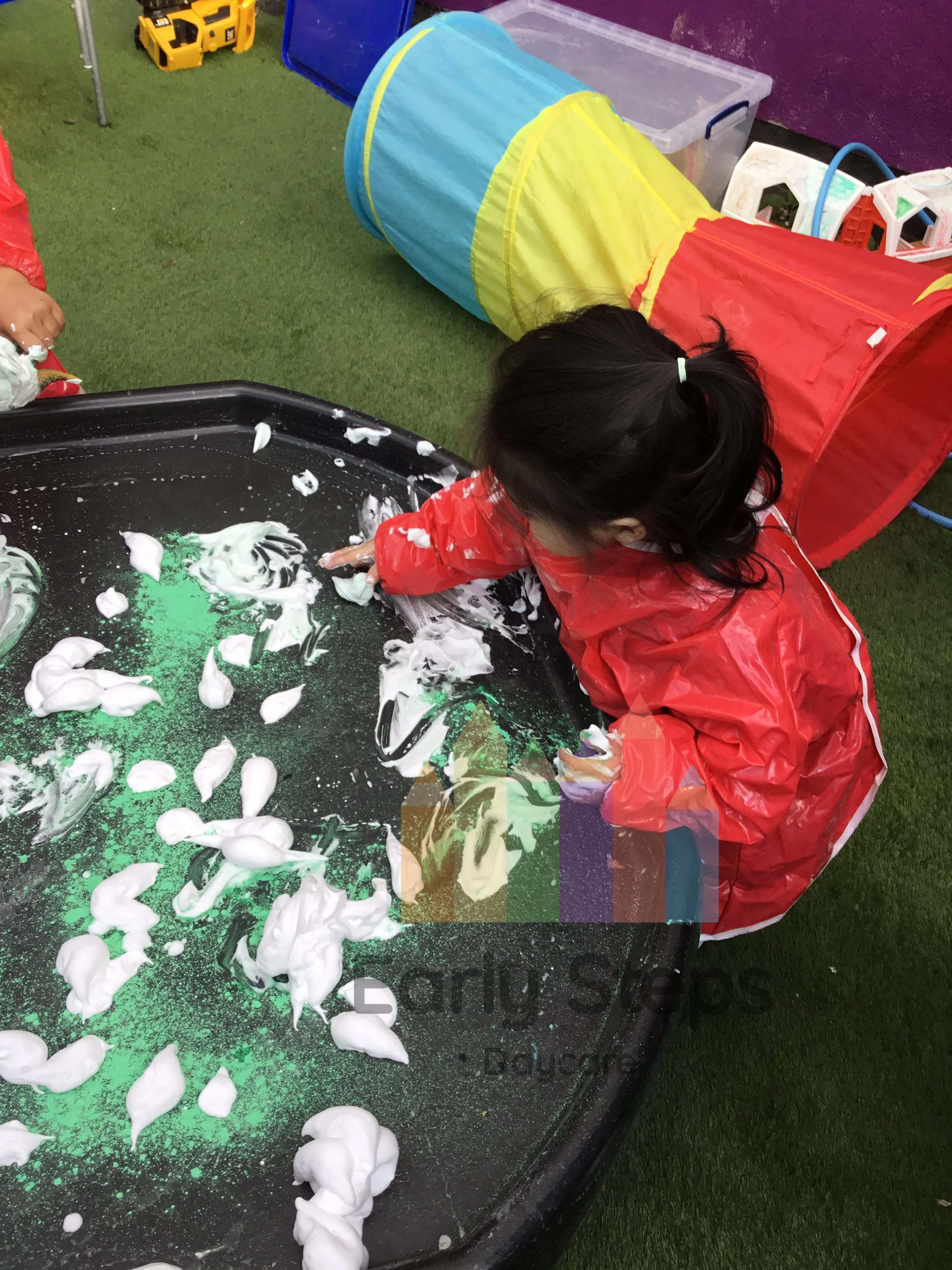 Our nursery’s expressive arts and design includes messy foam play, allowing children to explore textures, develop sensory skills, and boost creativity.