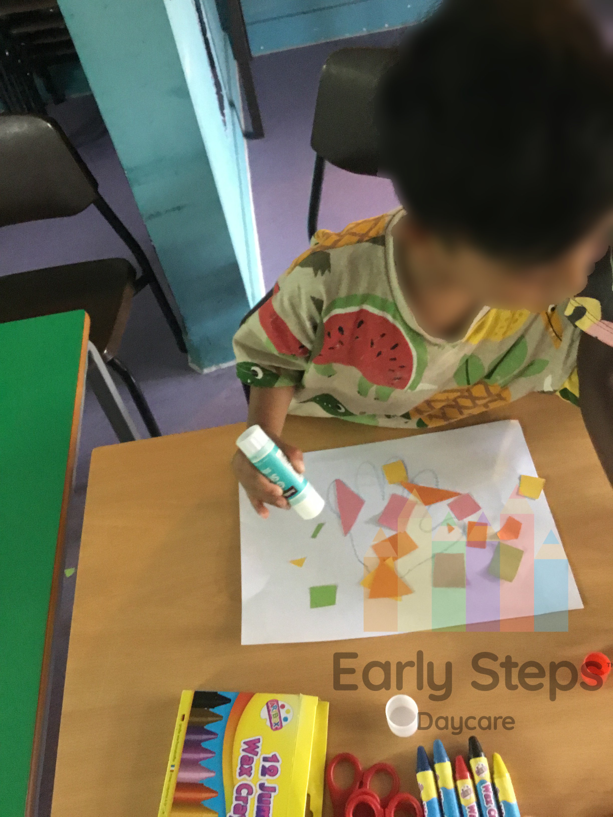 During expressive arts and design activities, children develop fine motor skills and creativity by sticking materials with glue.
