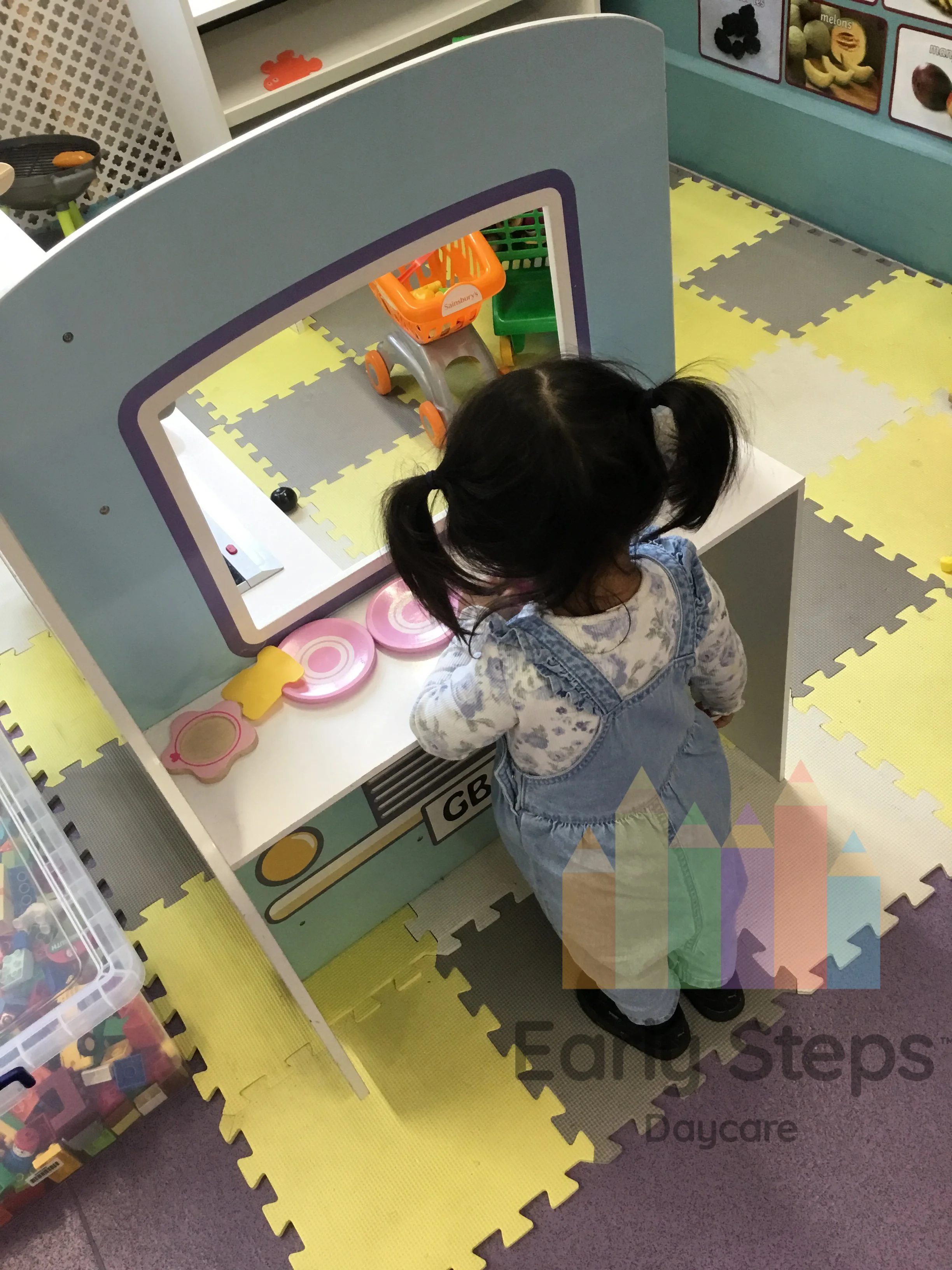 Encouraging imagination and role-play through pretend kitchen play – supporting Expressive Arts and Design in EYFS.
