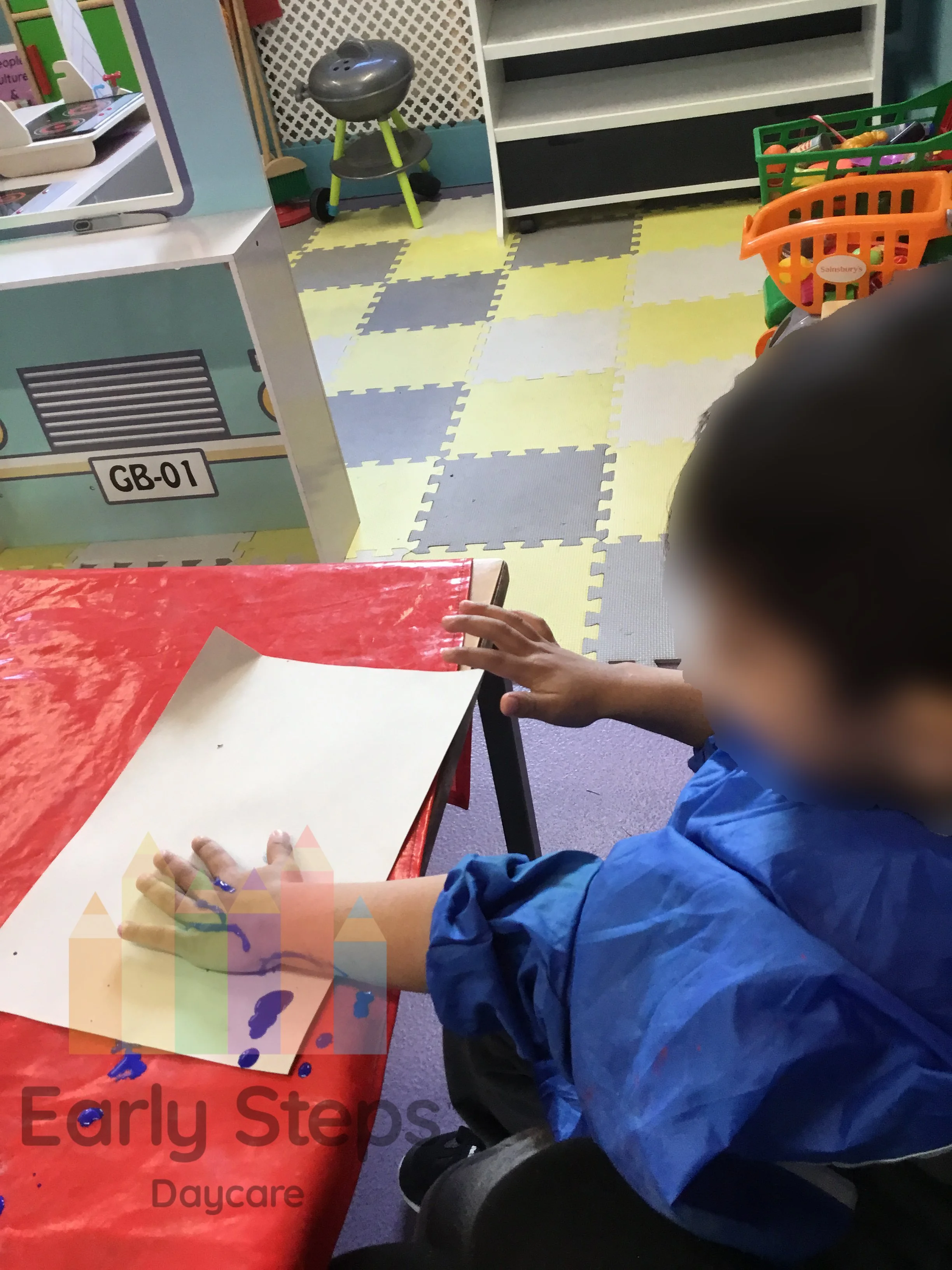 Children in our nursery develop creativity and sensory skills through expressive arts and design activities like making colourful handprints.