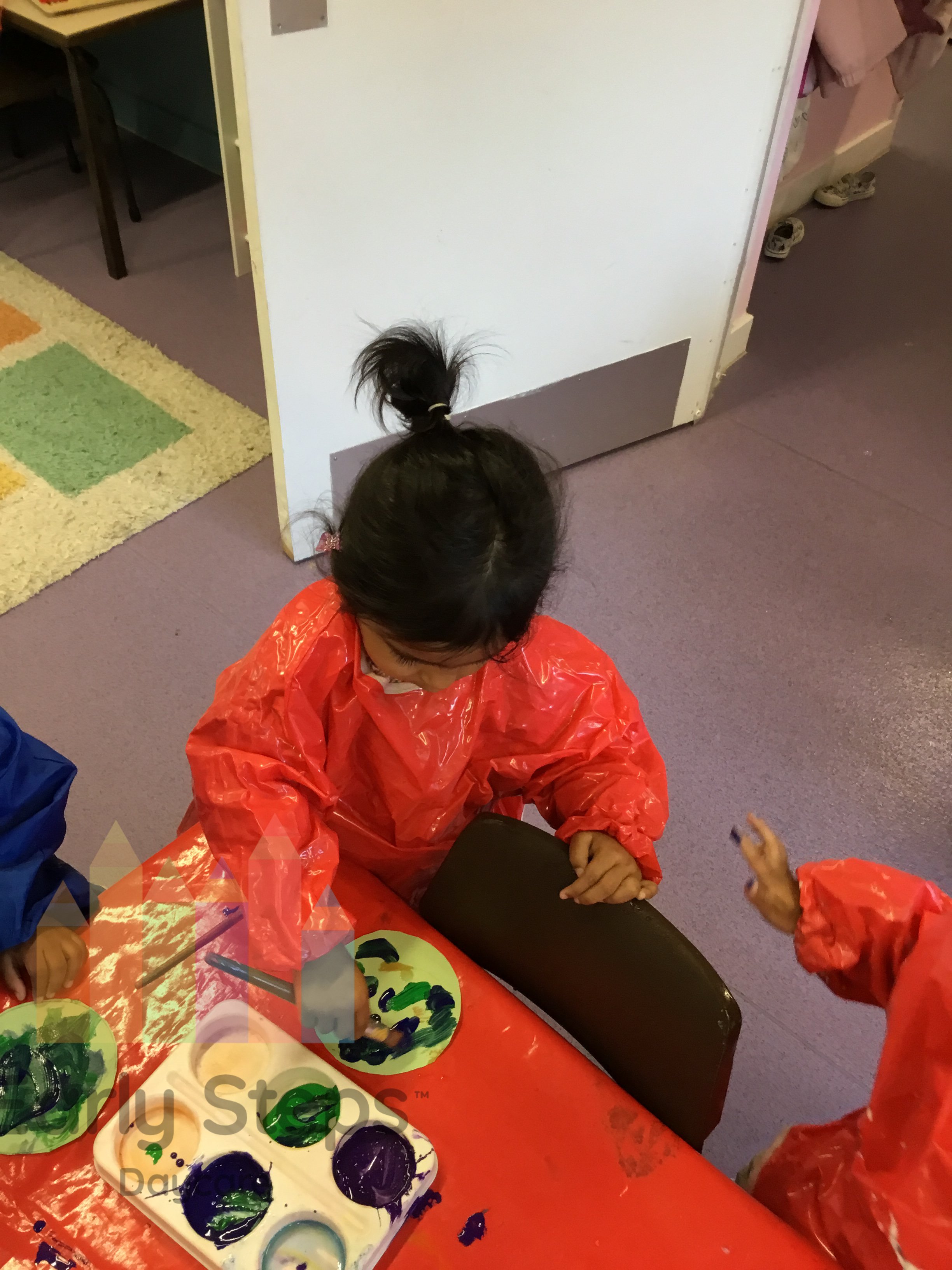 Children explore creativity and early design skills by painting patterns during expressive arts and design activities at our nursery
