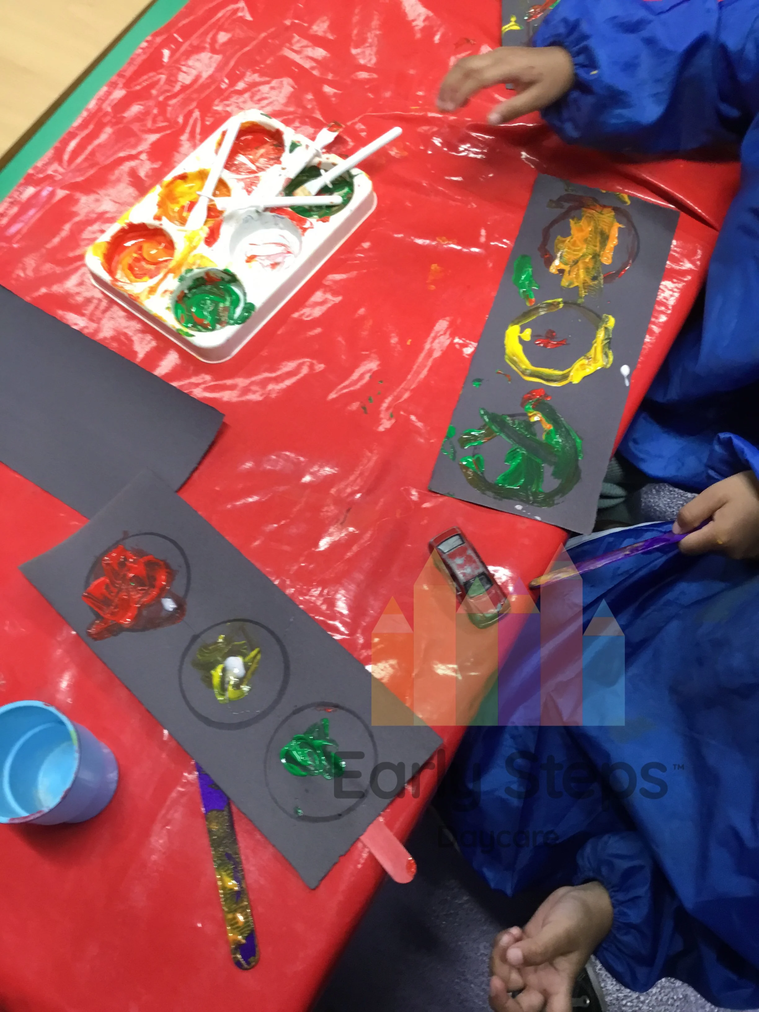 Children engage in expressive arts and design by painting traffic lights, enhancing their creativity while learning about colours and road safety.