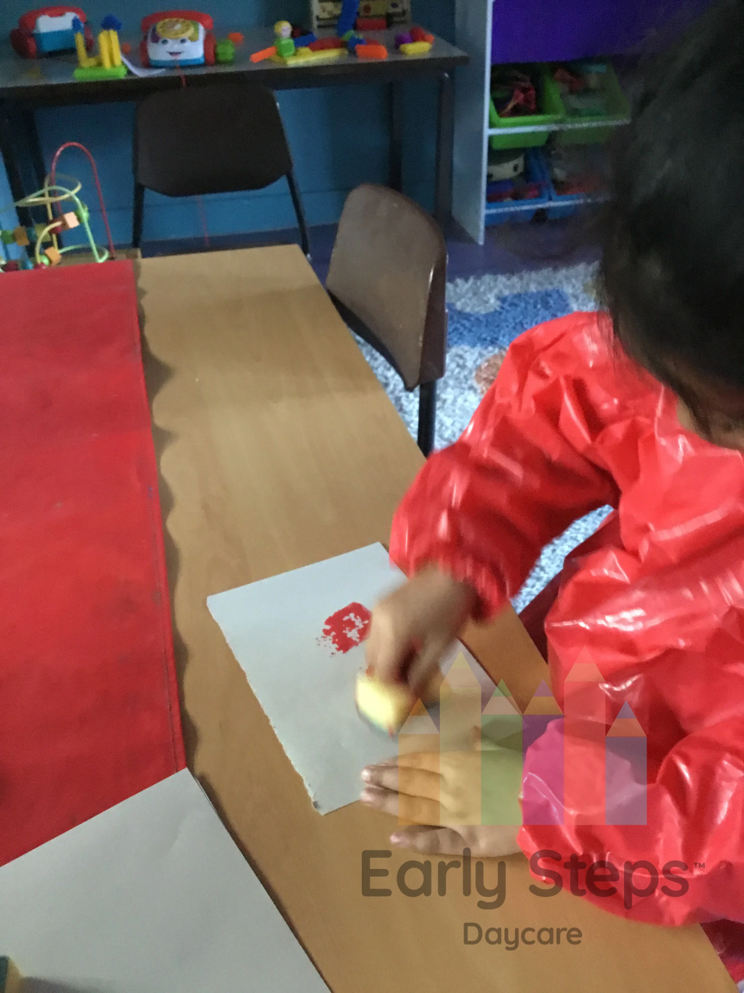 In our nursery’s expressive arts and design sessions, children use sponges to make colourful prints—enhancing creativity, sensory exploration, and fine motor skills.