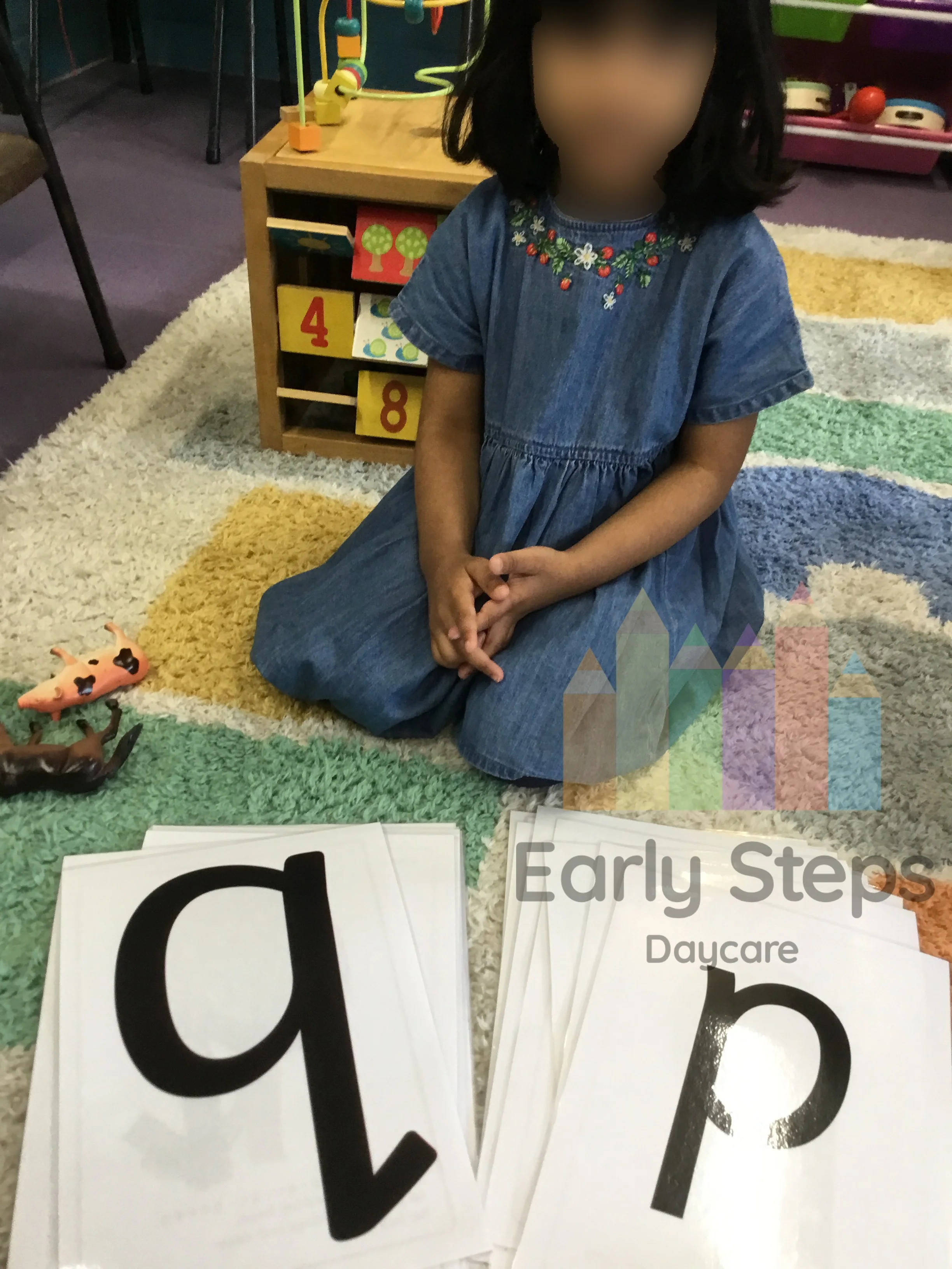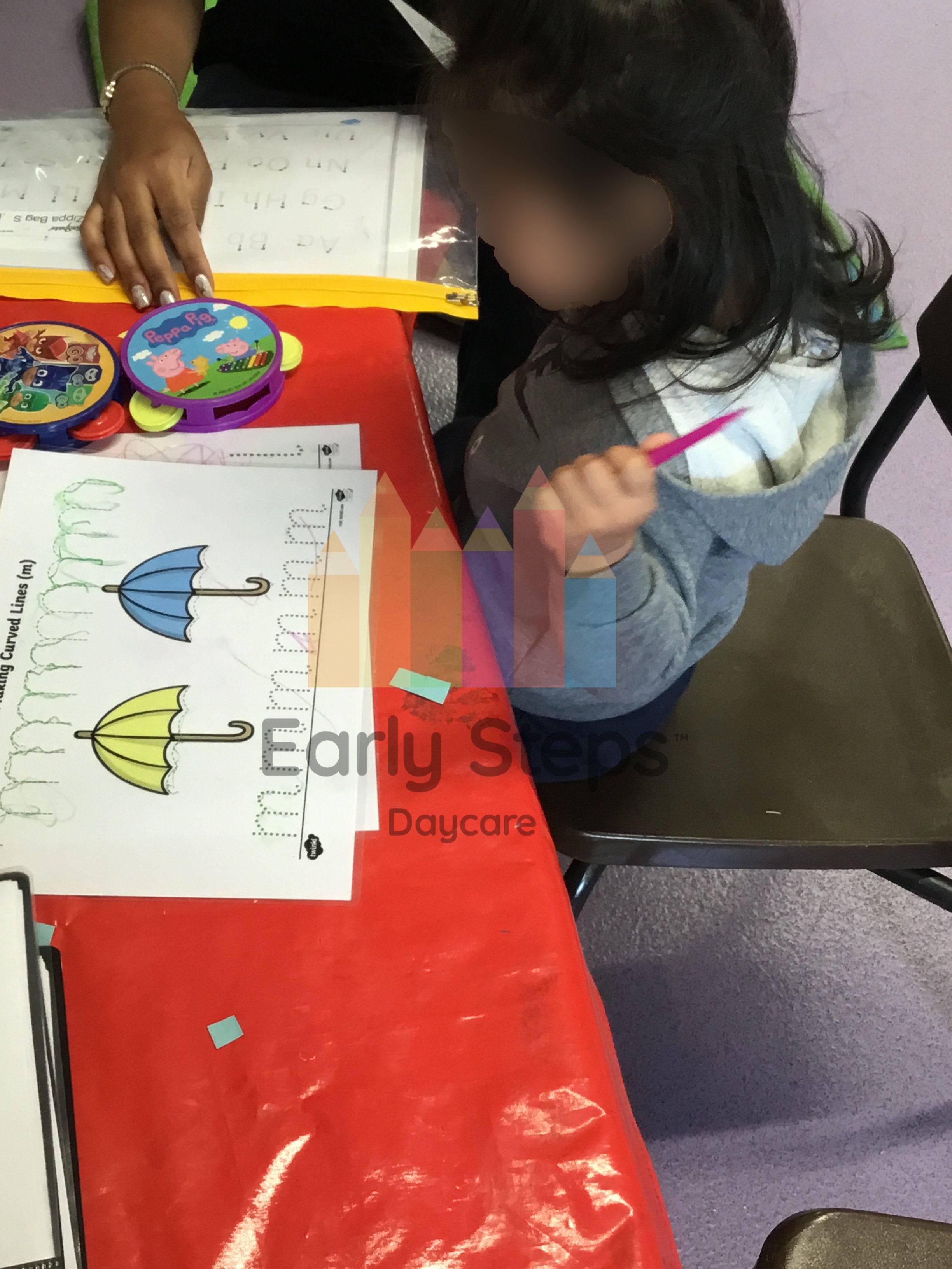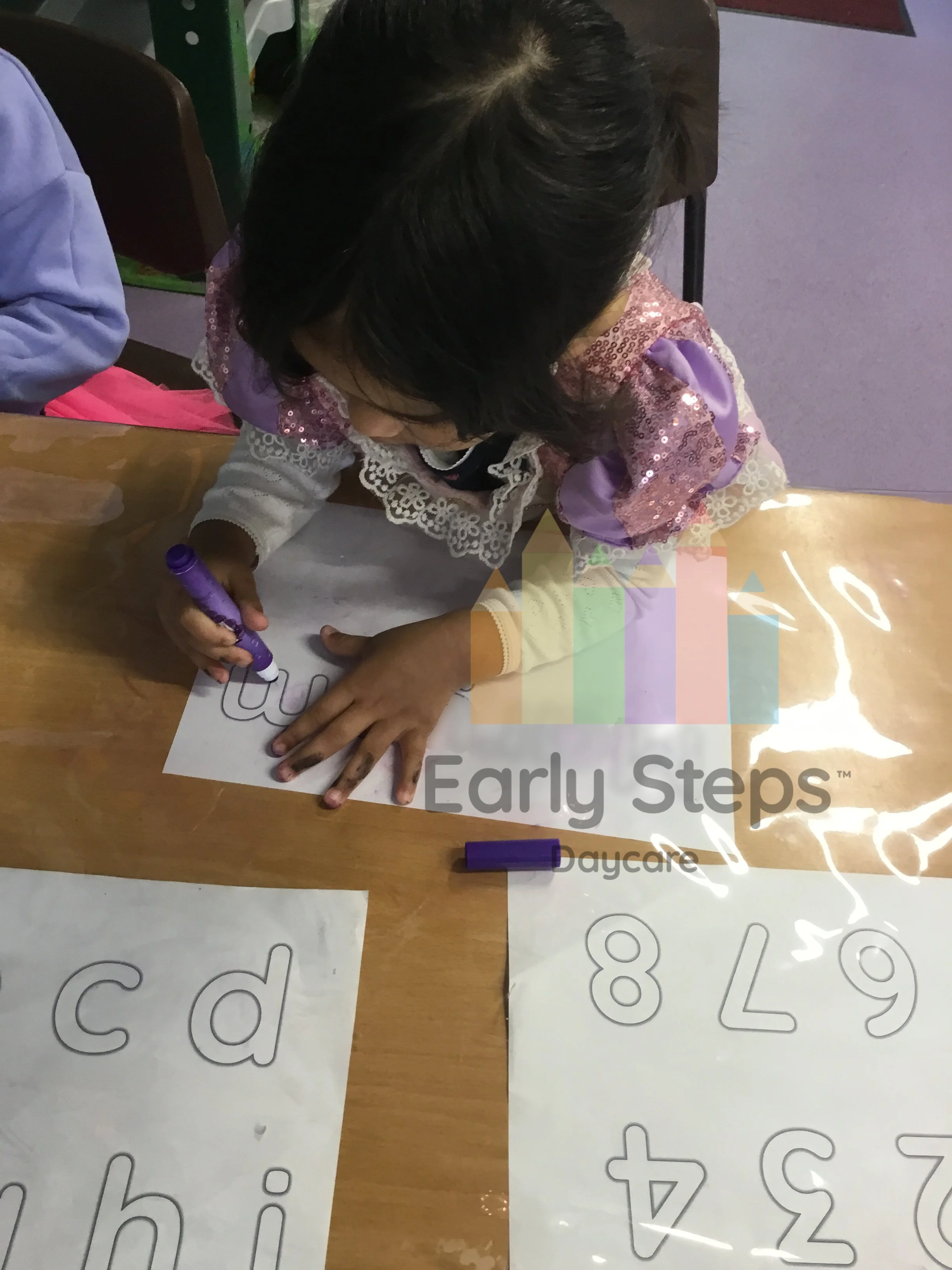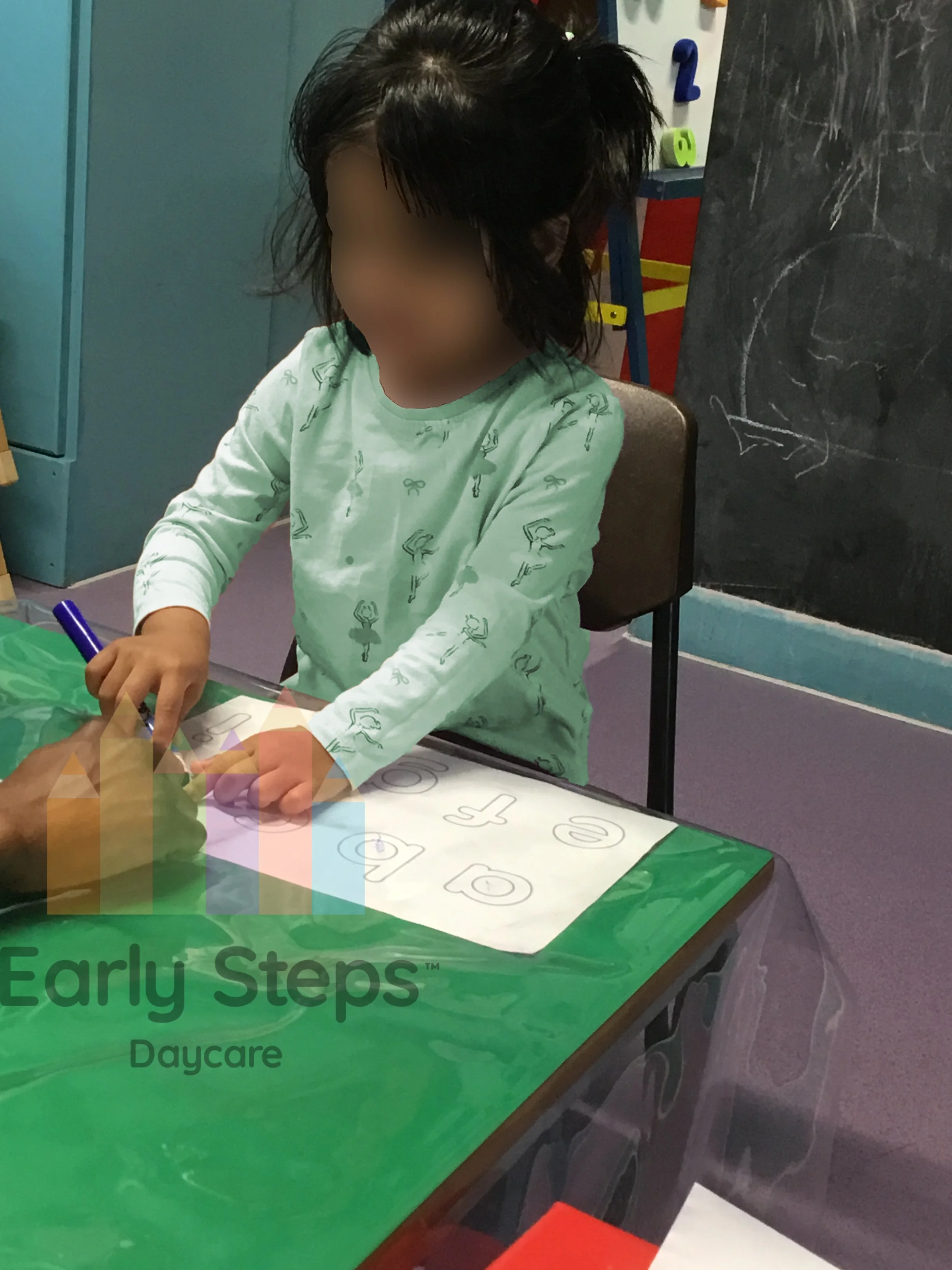 With gentle guidance, she builds confidence in her mark-making journey — developing fine motor control and early writing skills one letter at a time.