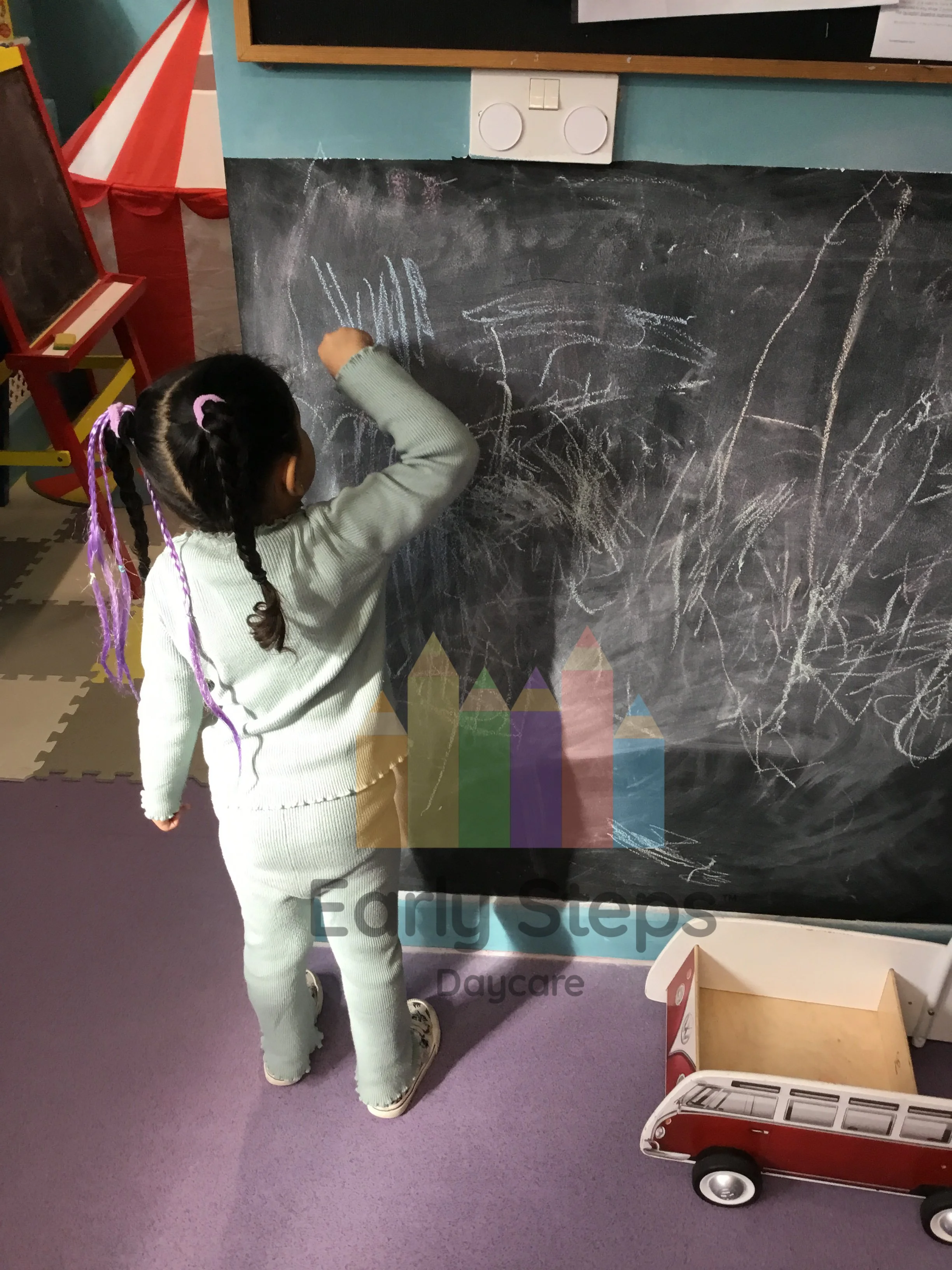 Practising mark-making on the blackboard helps develop early writing skills and strengthens fine motor control—one chalk stroke at a time!