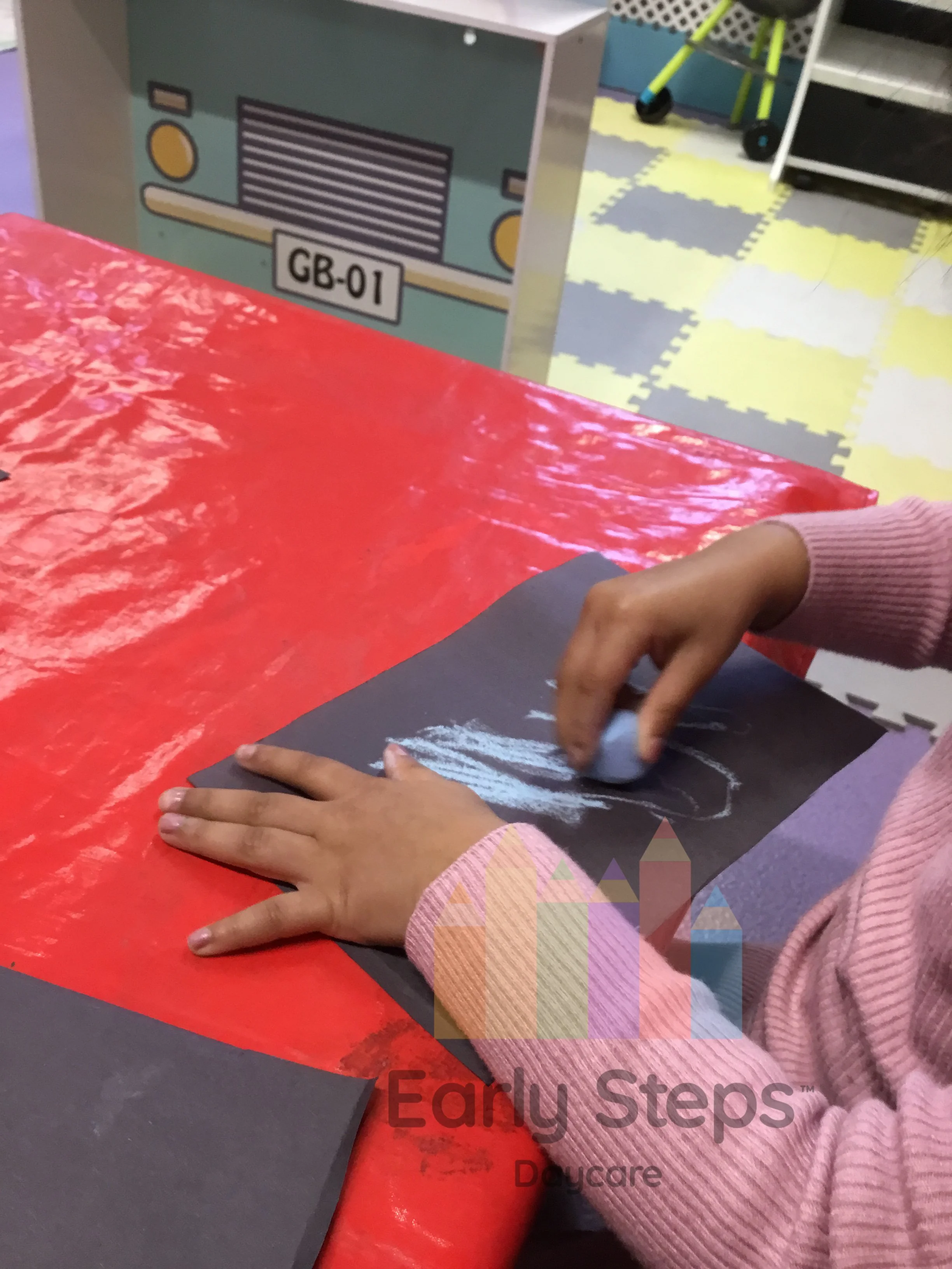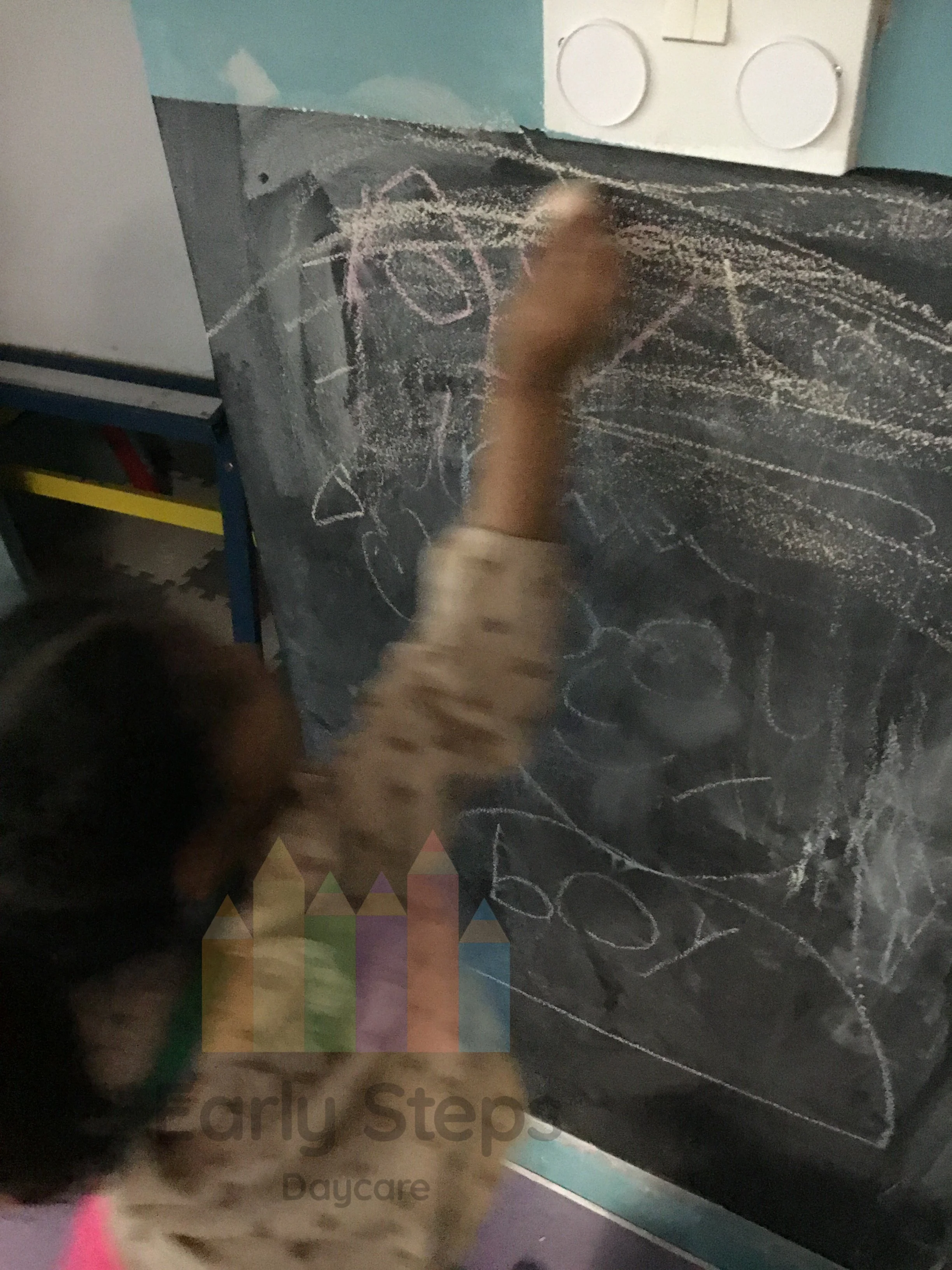 Expressing creativity through mark-making, this little learner uses chalk to build early writing skills and strengthen fine motor control—laying the foundation for literacy development.