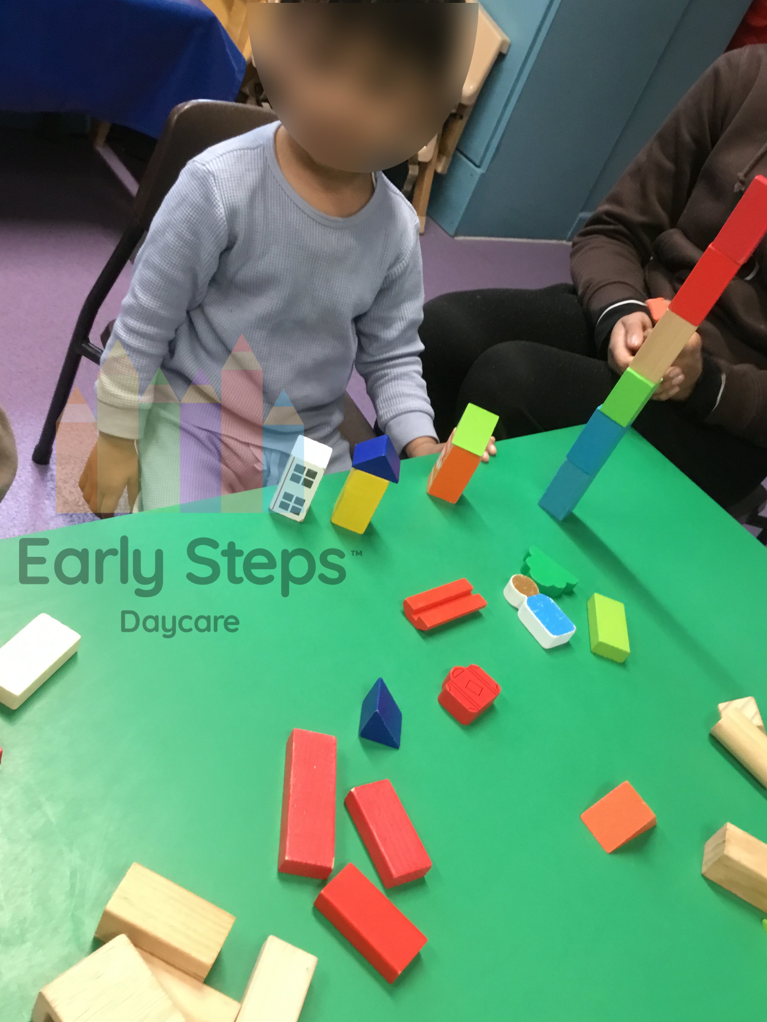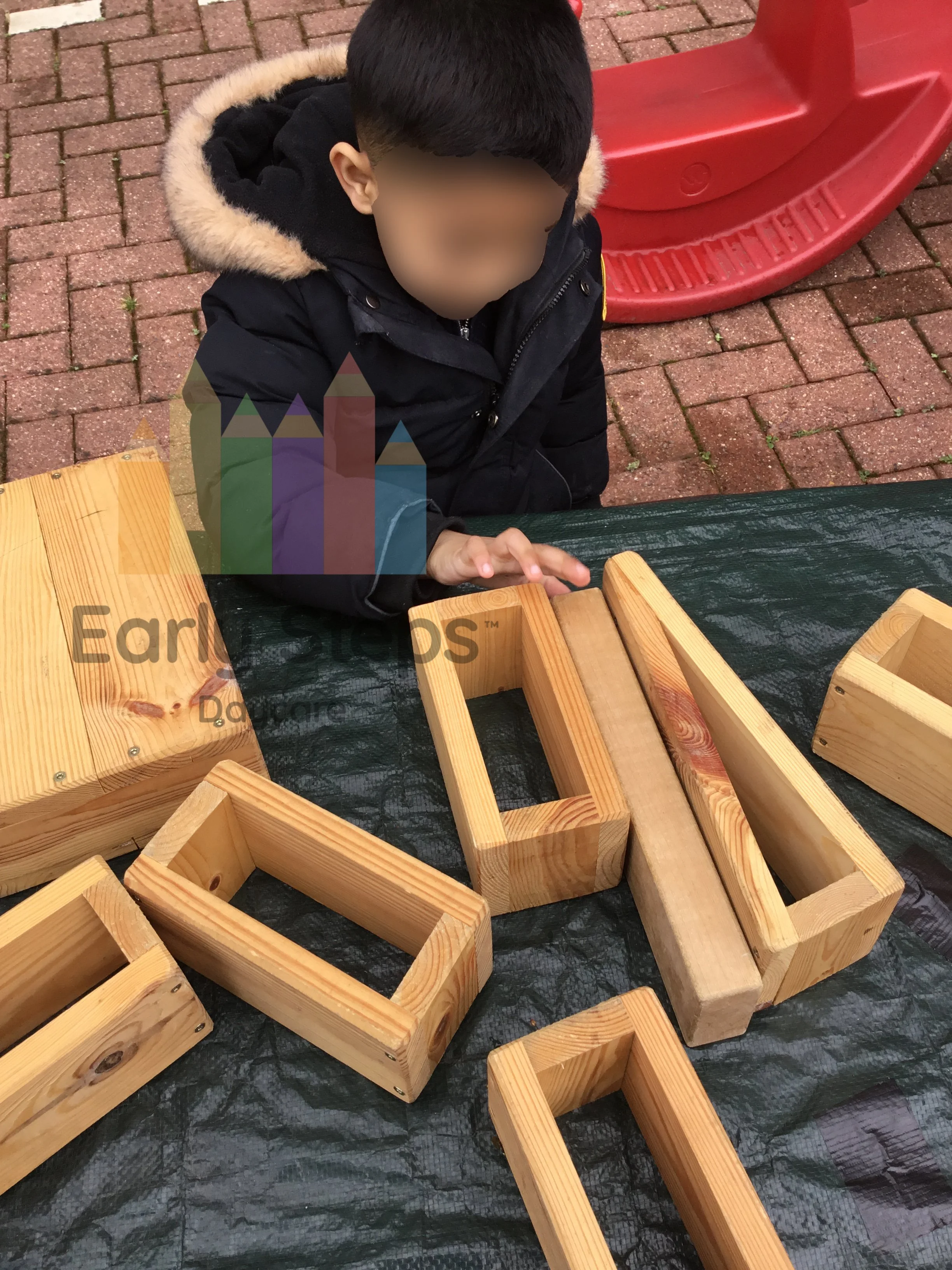 Exploring shapes and spatial awareness through hands-on play with wooden blocks – supporting early maths development in EYFS.