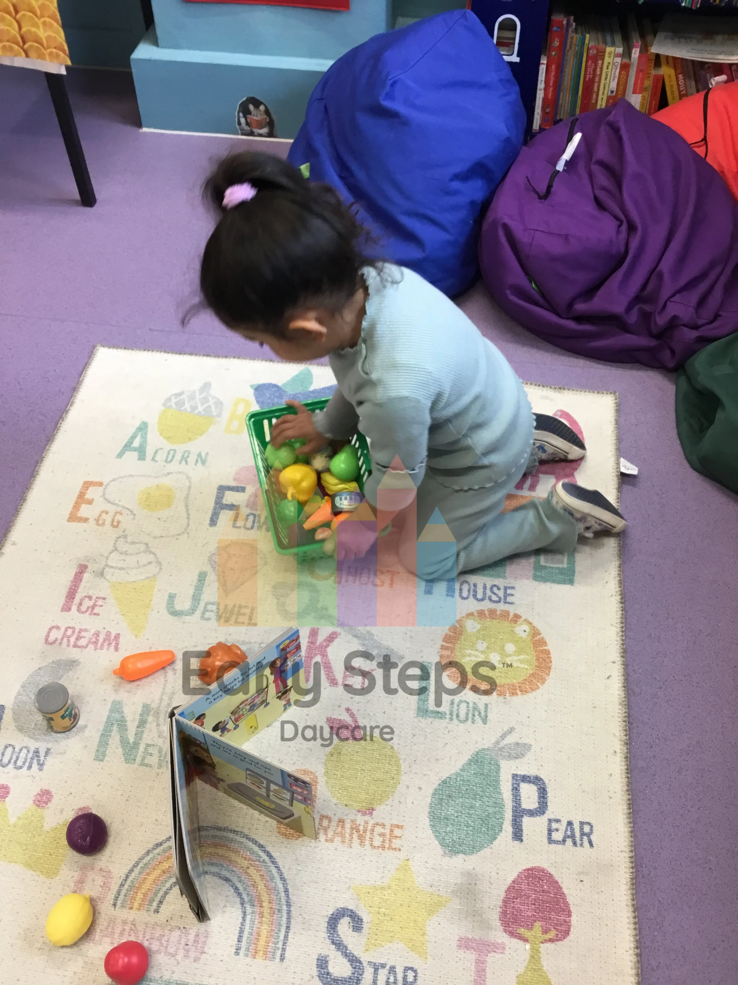 Children build early maths skills and colour recognition by sorting fruits and vegetables by shapes and colours during hands-on learning.