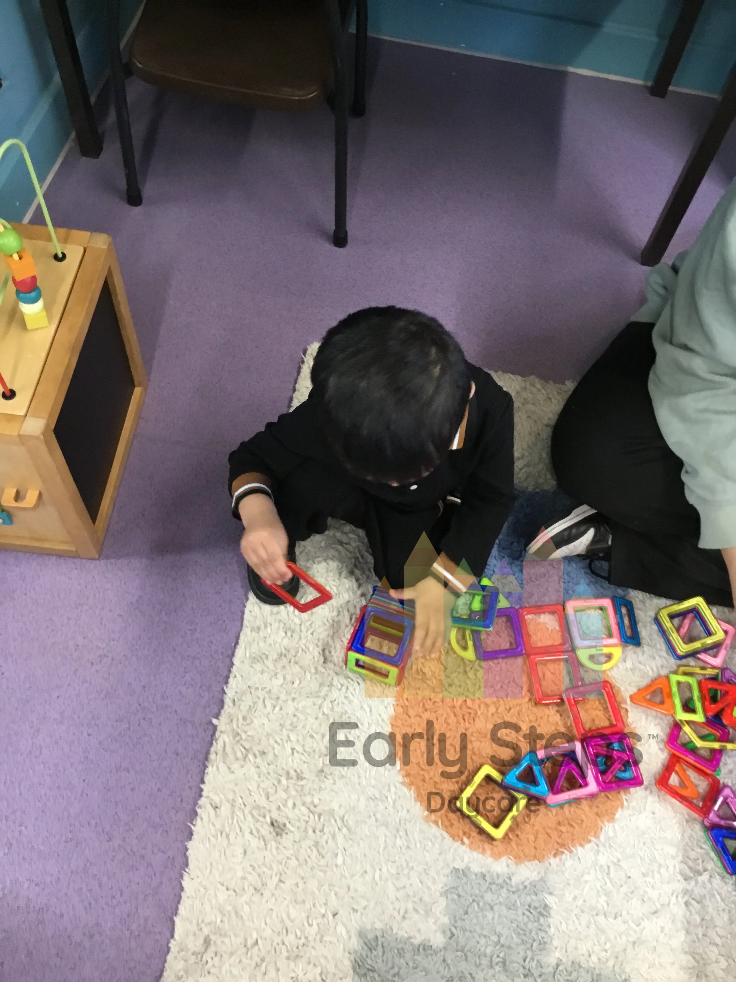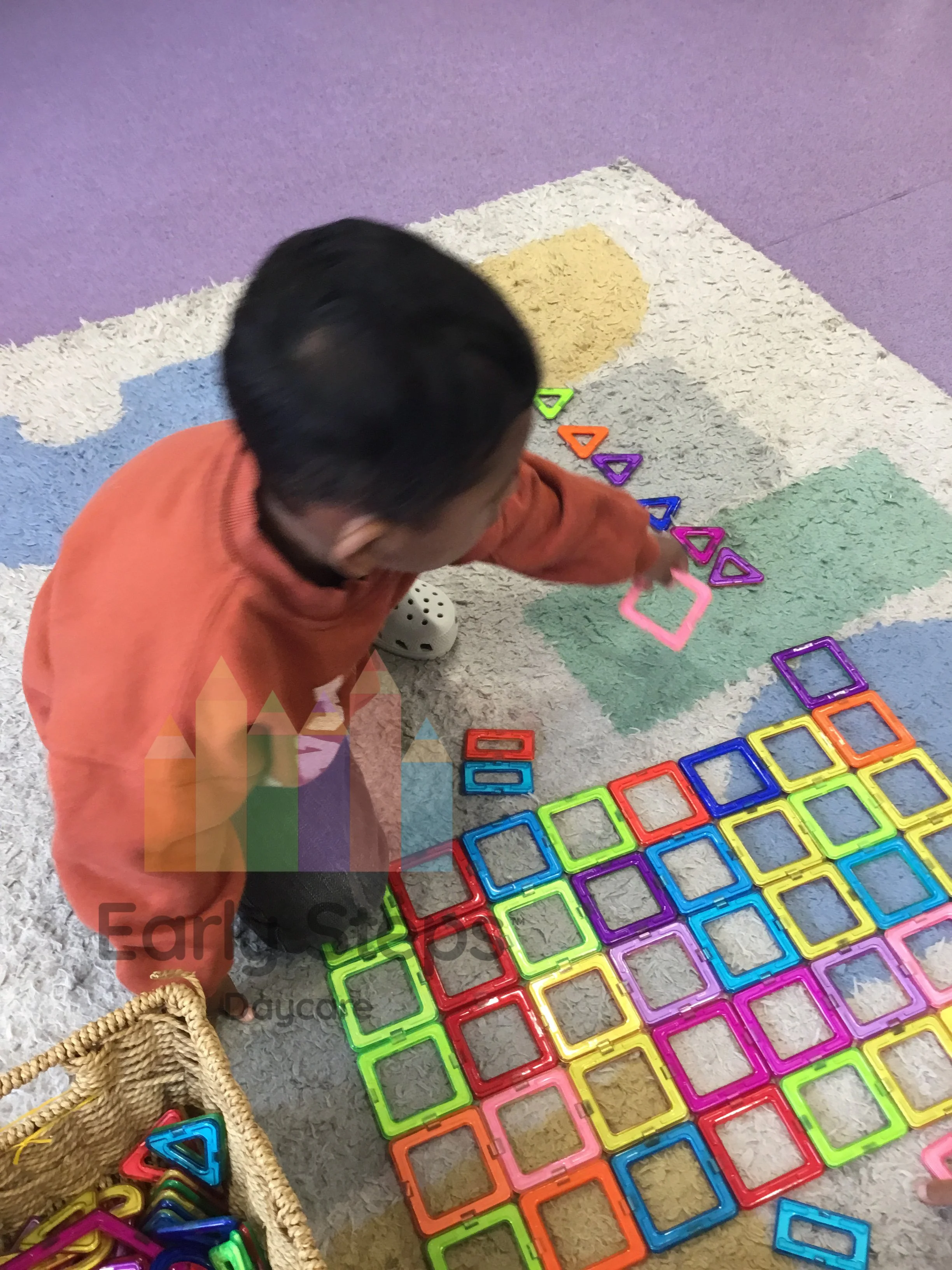 Children develop spatial awareness and early maths skills by arranging magnetic squares during hands-on learning activities.