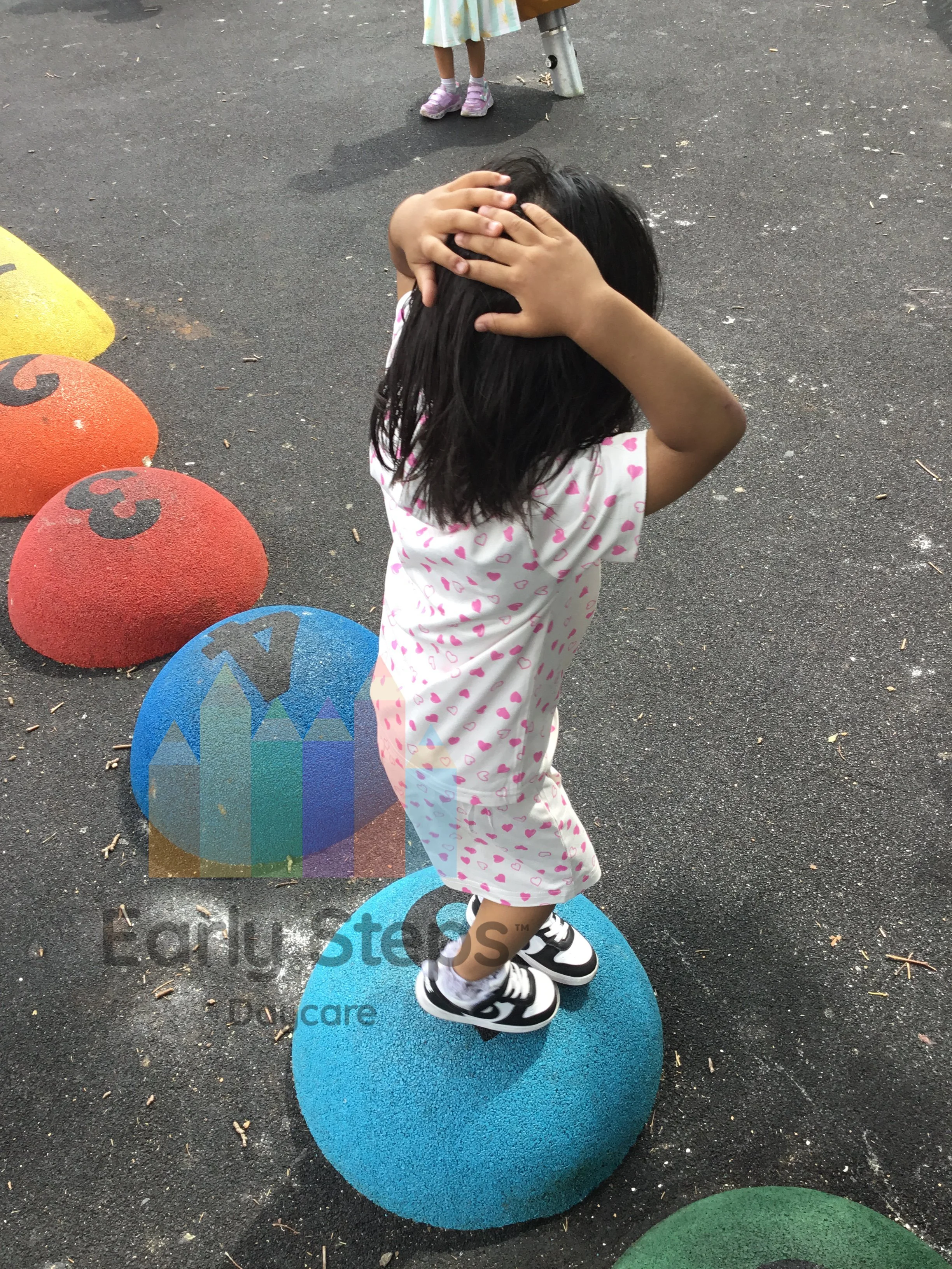 Children develop early mathematics skills and physical coordination by jumping on numbered bumps during outdoor learning activities..
