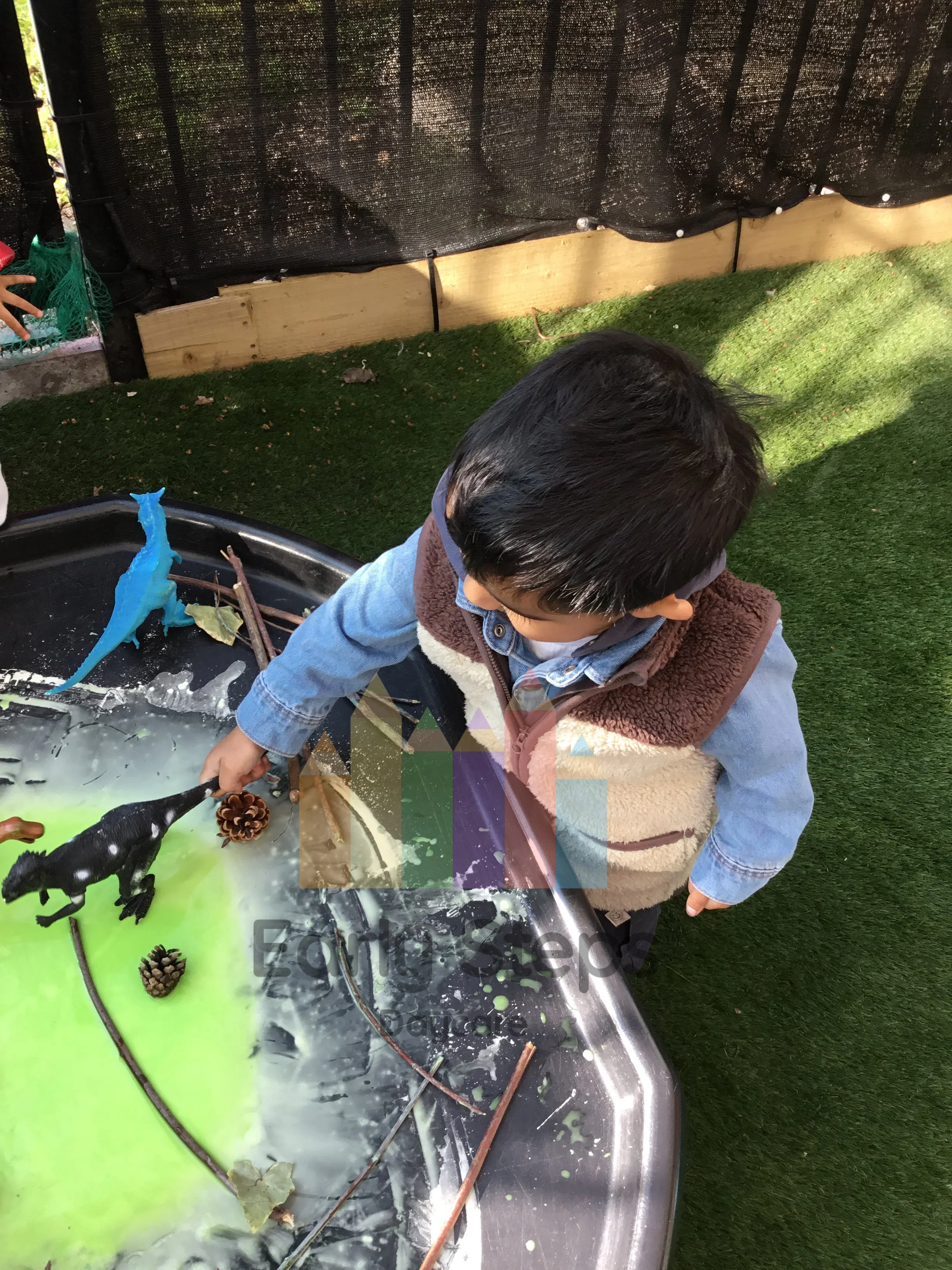 Children create swamp habitats for toy dinosaurs, learning about prehistoric environments and how dinosaurs lived, supporting Understanding the World skills.