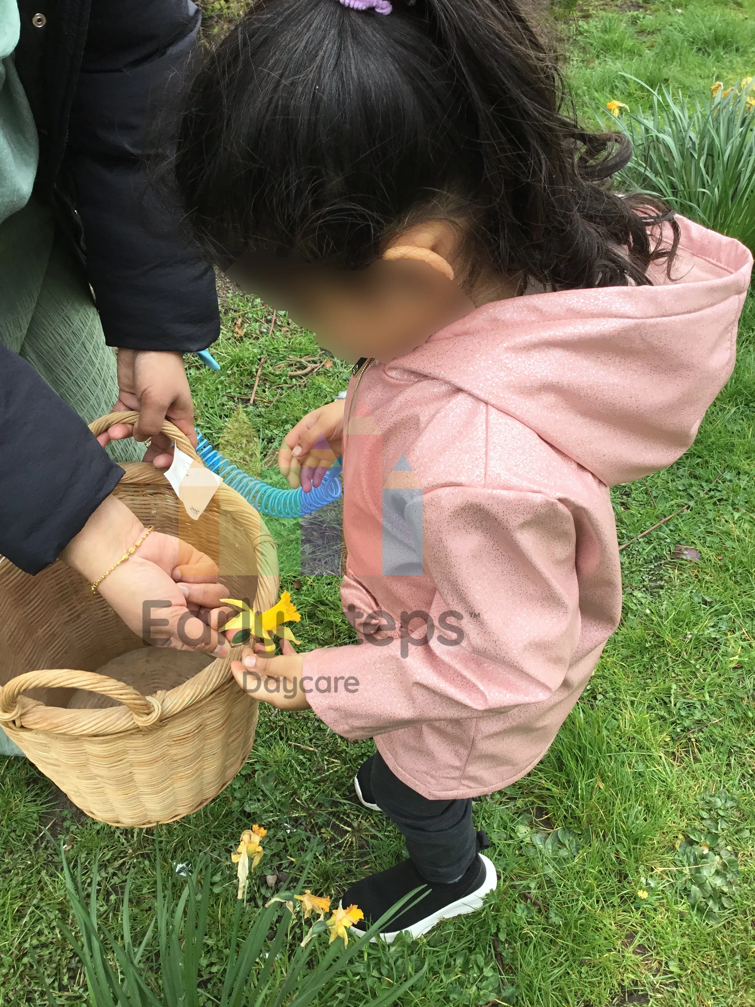 Girl collects daffodils at the local park, exploring nature, seasonal changes, and the environment, supporting Understanding the World skills.