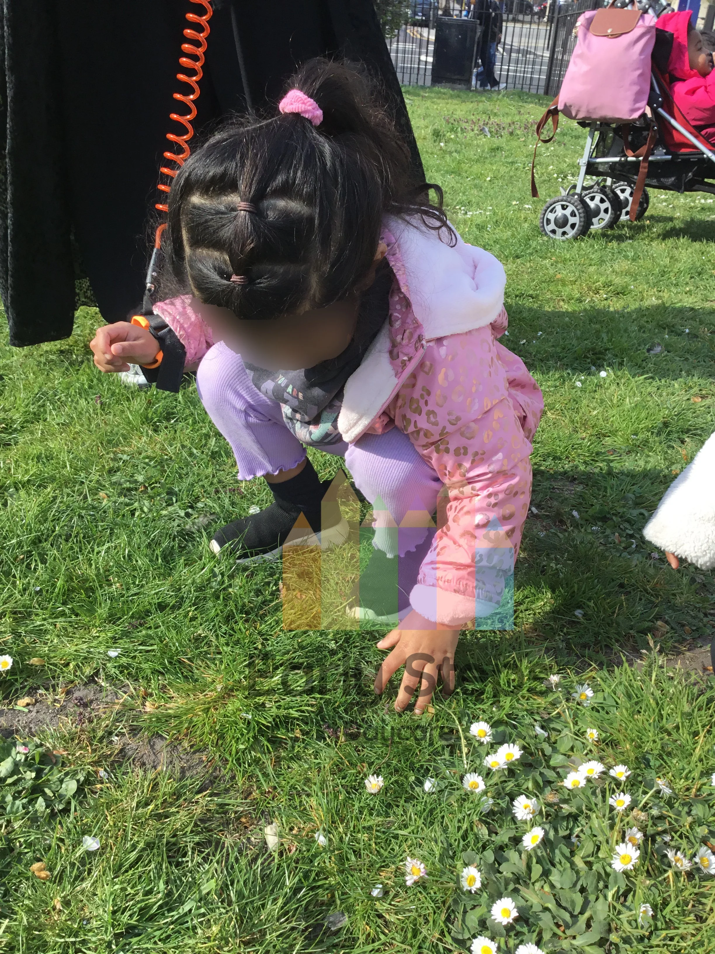 Children pick daisies at their local park, exploring nature, plant life, and seasonal changes, supporting Understanding the World skills.