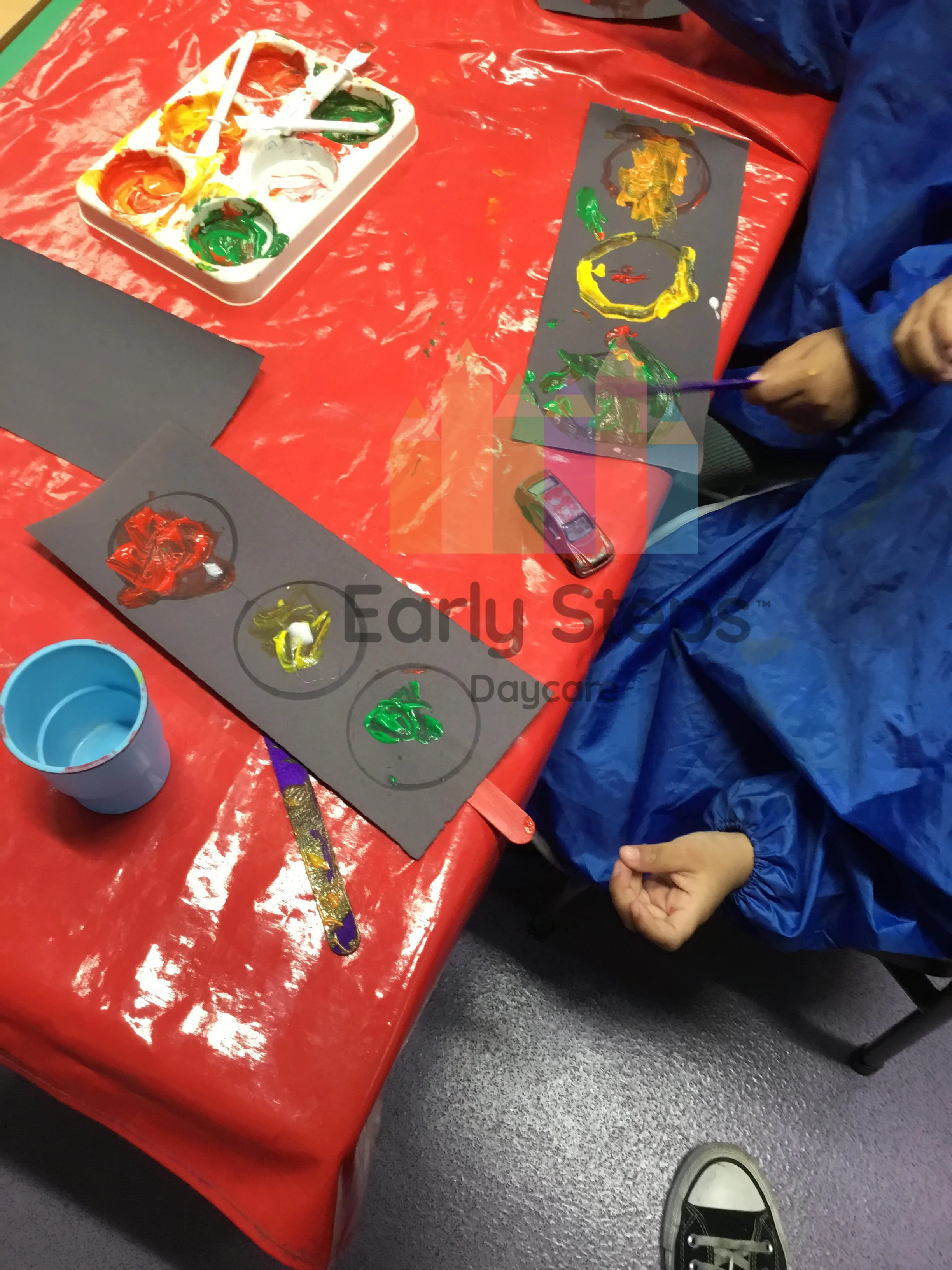 Nursery children paint and draw traffic lights to explore colors, creative expression, and learn about road safety, linking to Understanding the World.