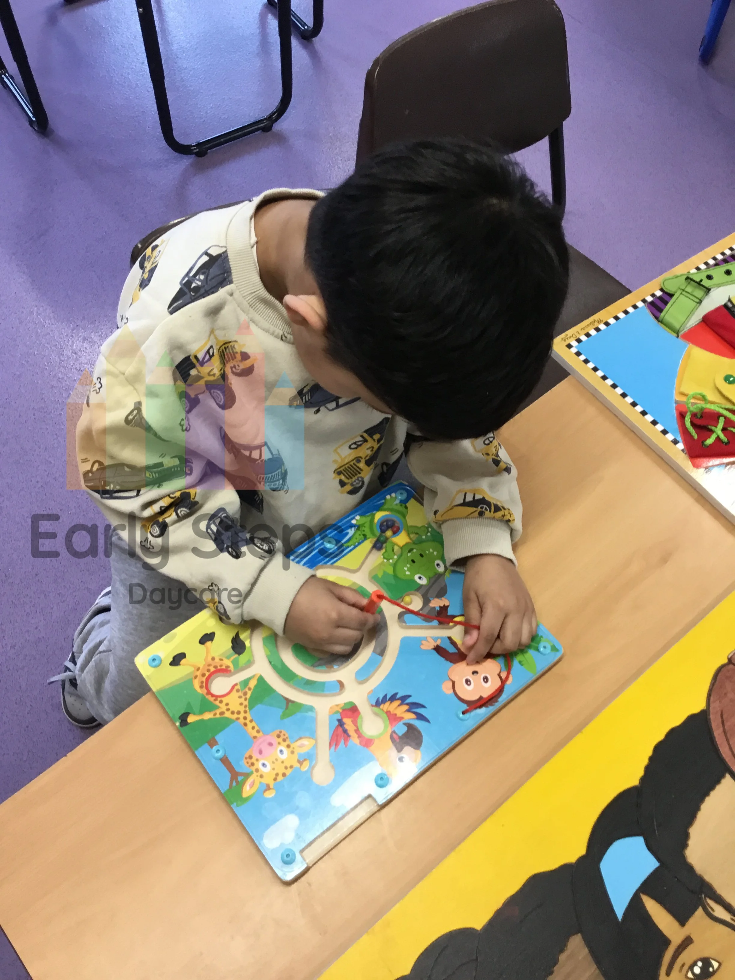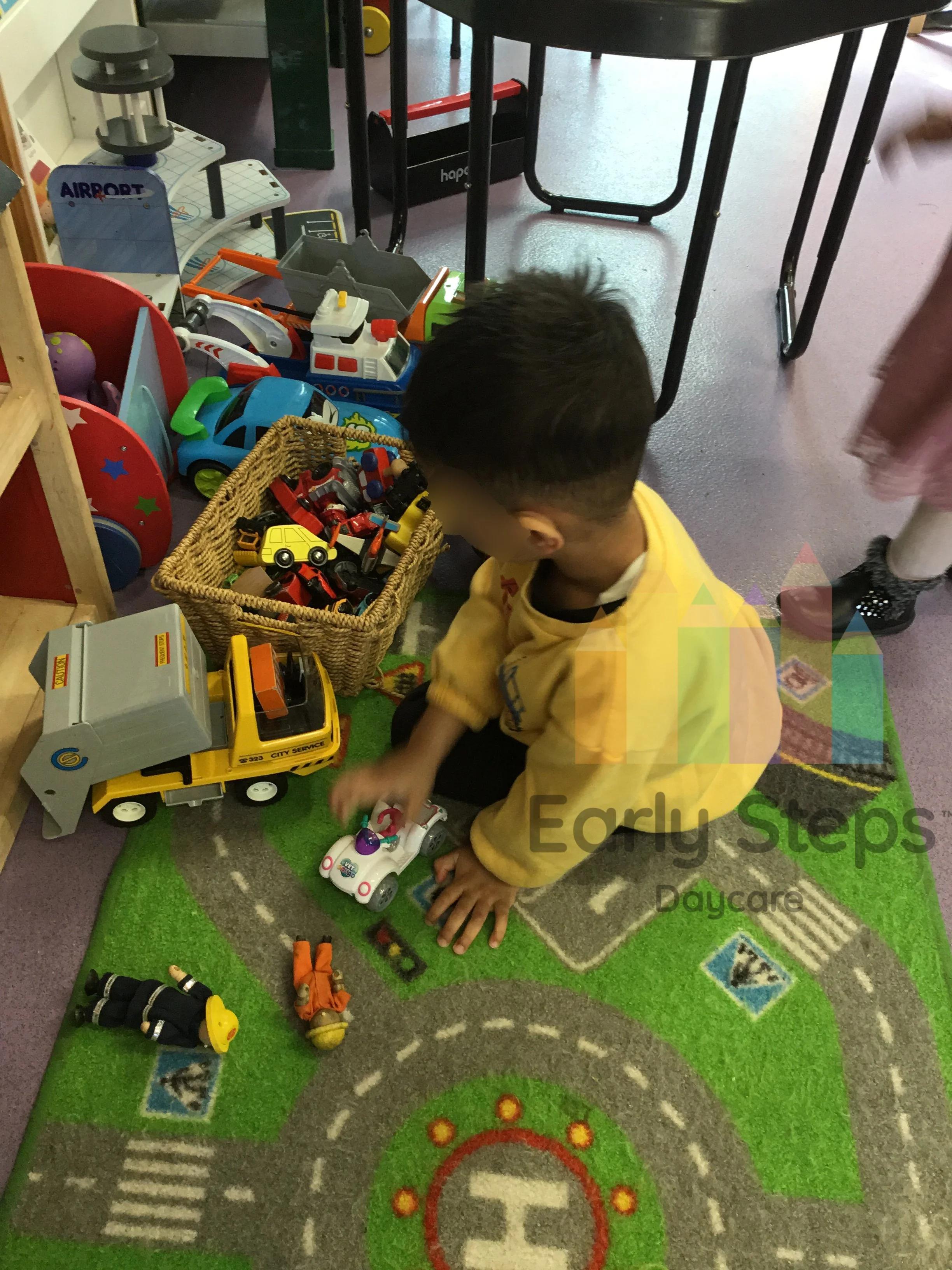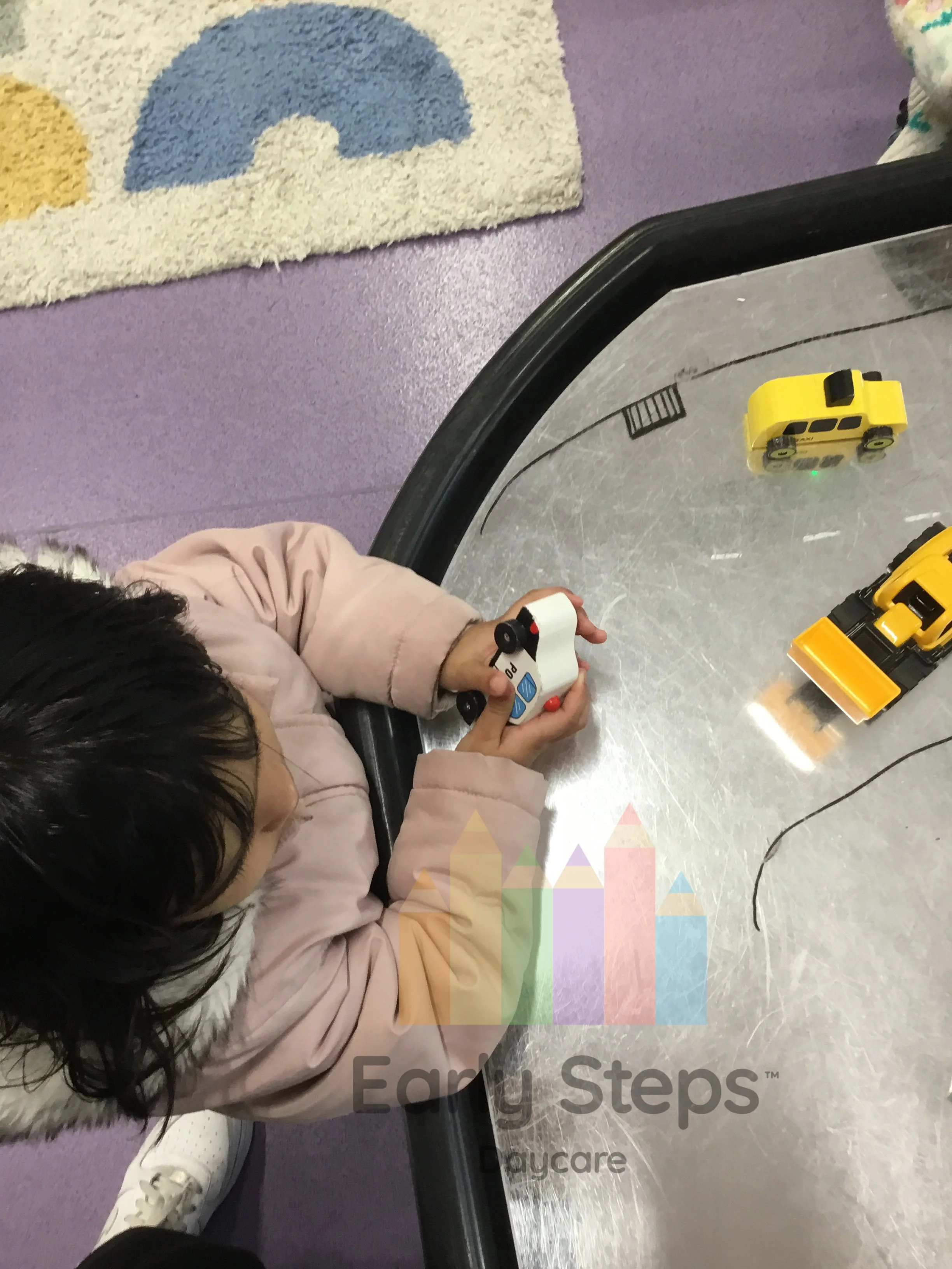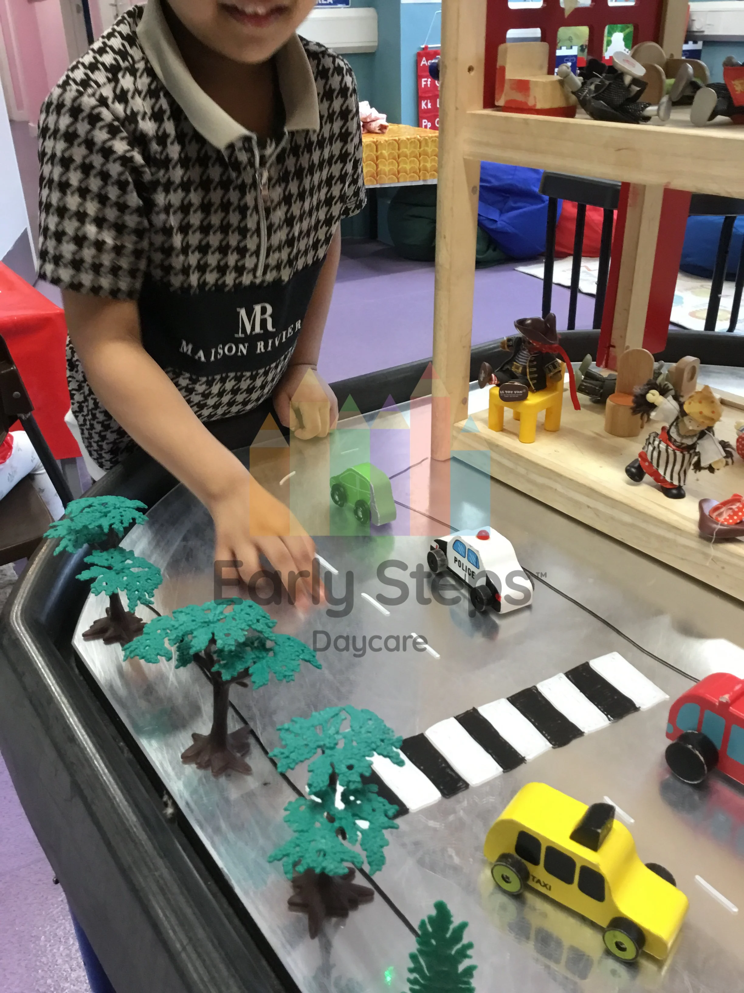 Child plays with toy cars at nursery, exploring road safety, traffic rules, and community awareness, supporting Understanding the World skills.