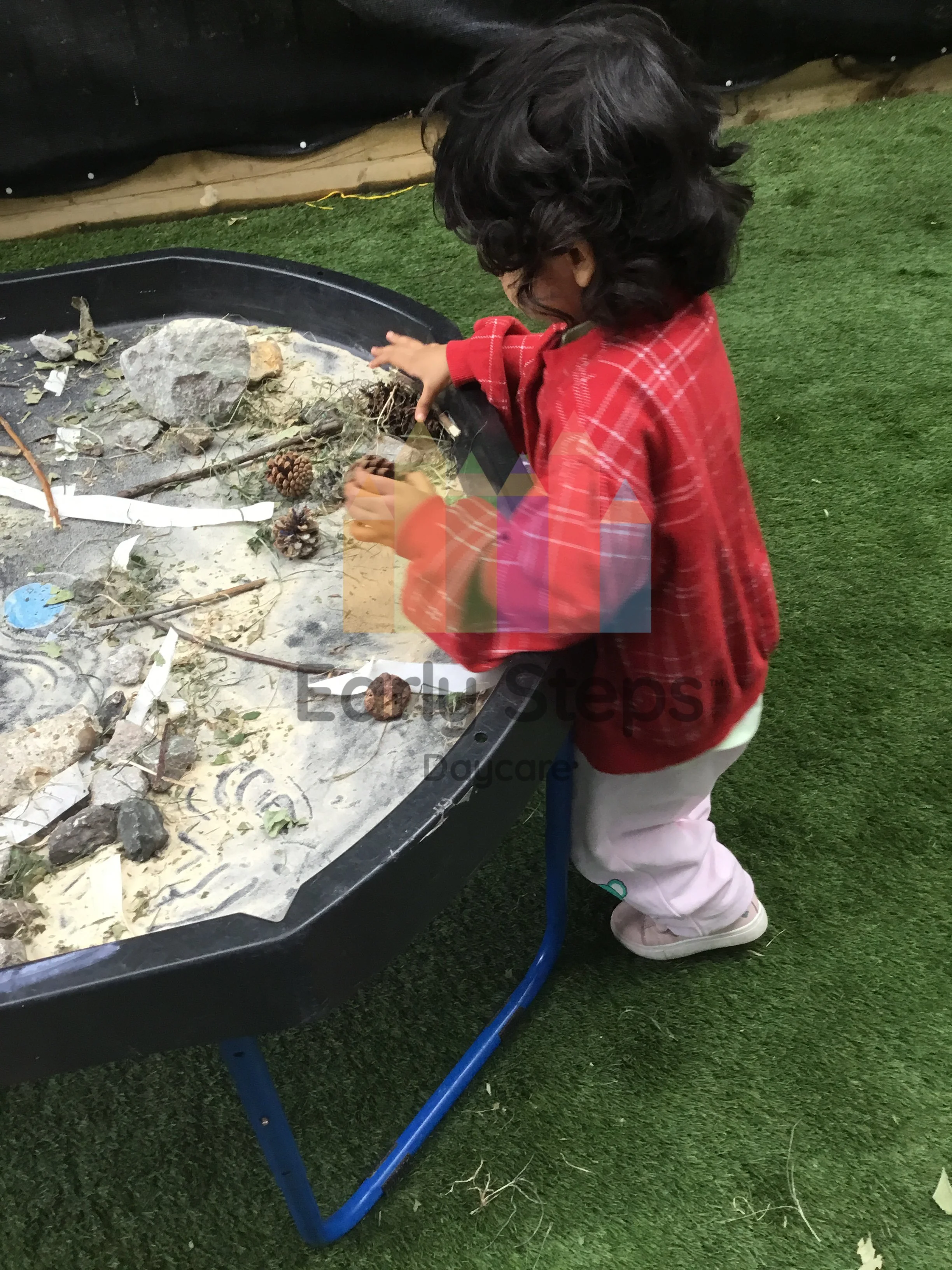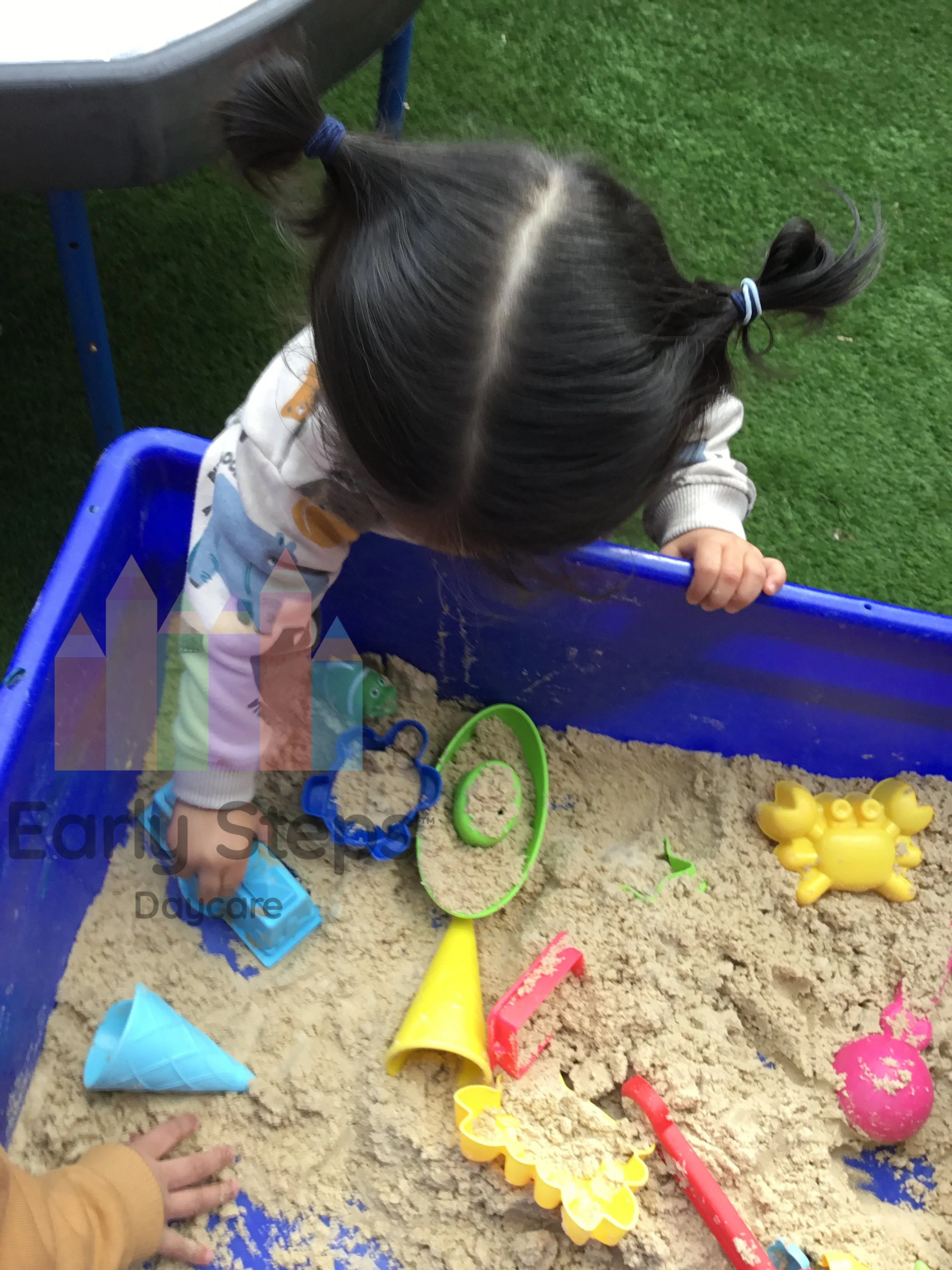 Child plays with sand at nursery, exploring textures, building, and early scientific concepts, supporting Understanding the World skills