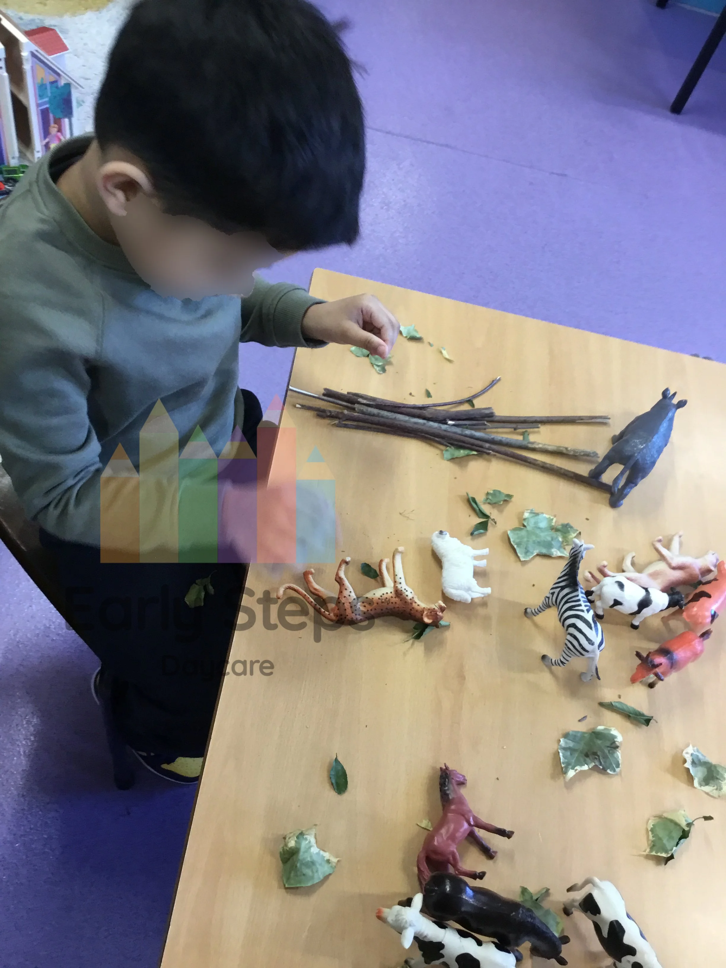 Child creates habitats for animals at nursery, exploring animal homes, environments, and nature, supporting Understanding the World skills.