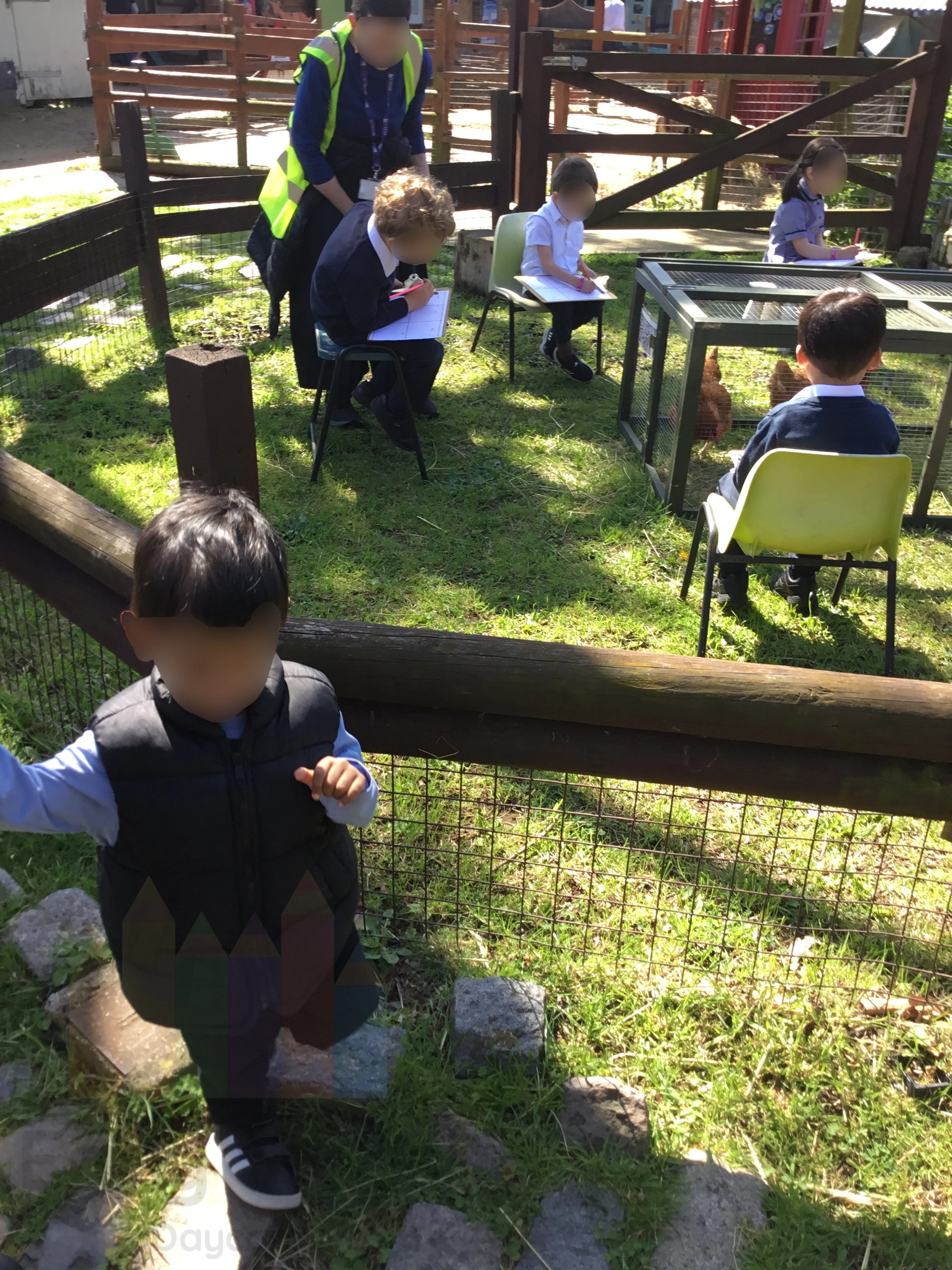 Child observes animals at the farm, exploring farm life, animal habitats, and nature, supporting Understanding the World skills.