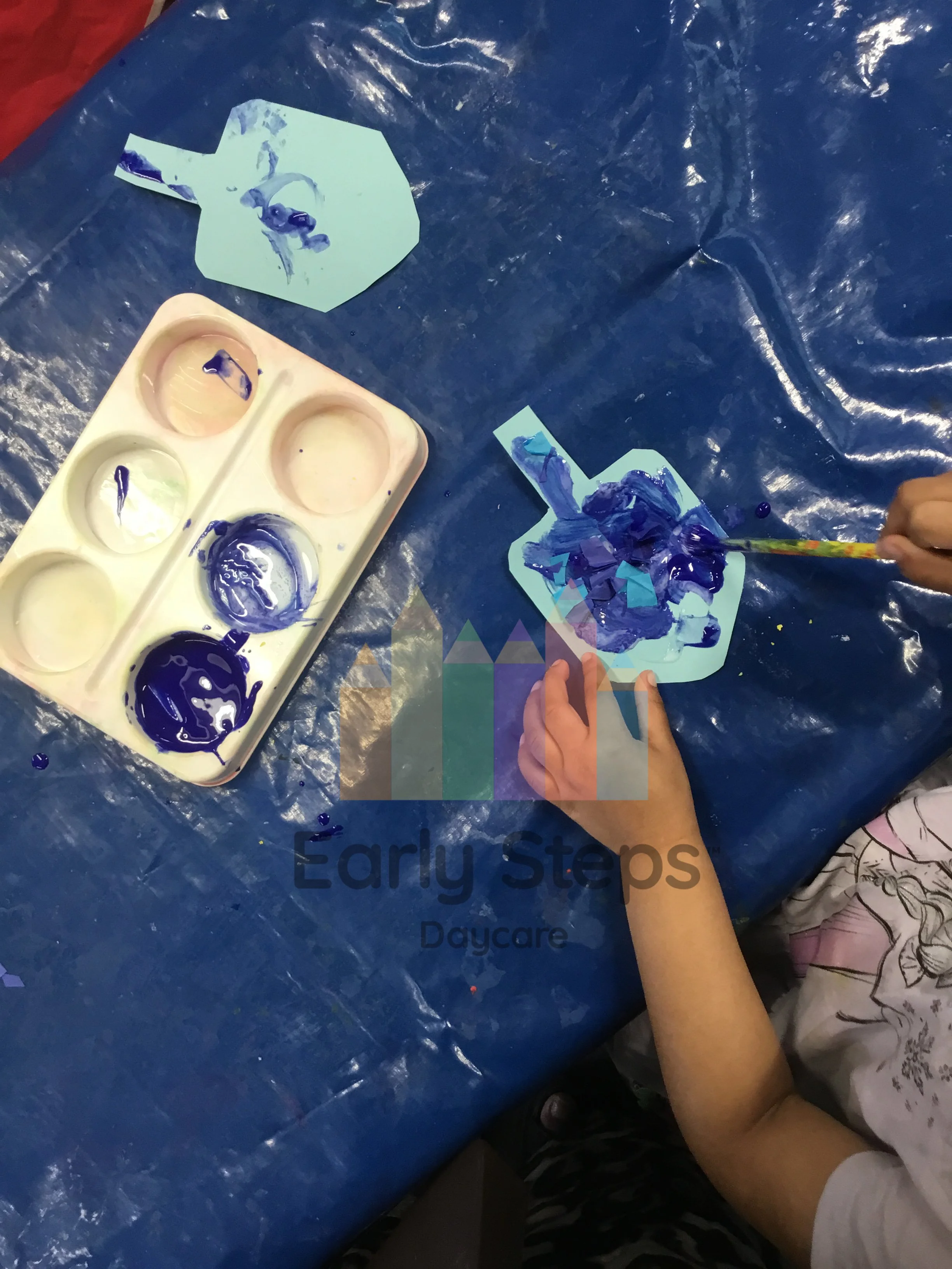 Child paints a dreidel at nursery, exploring Jewish traditions, festivals, and creative expression, supporting Understanding the World skills.