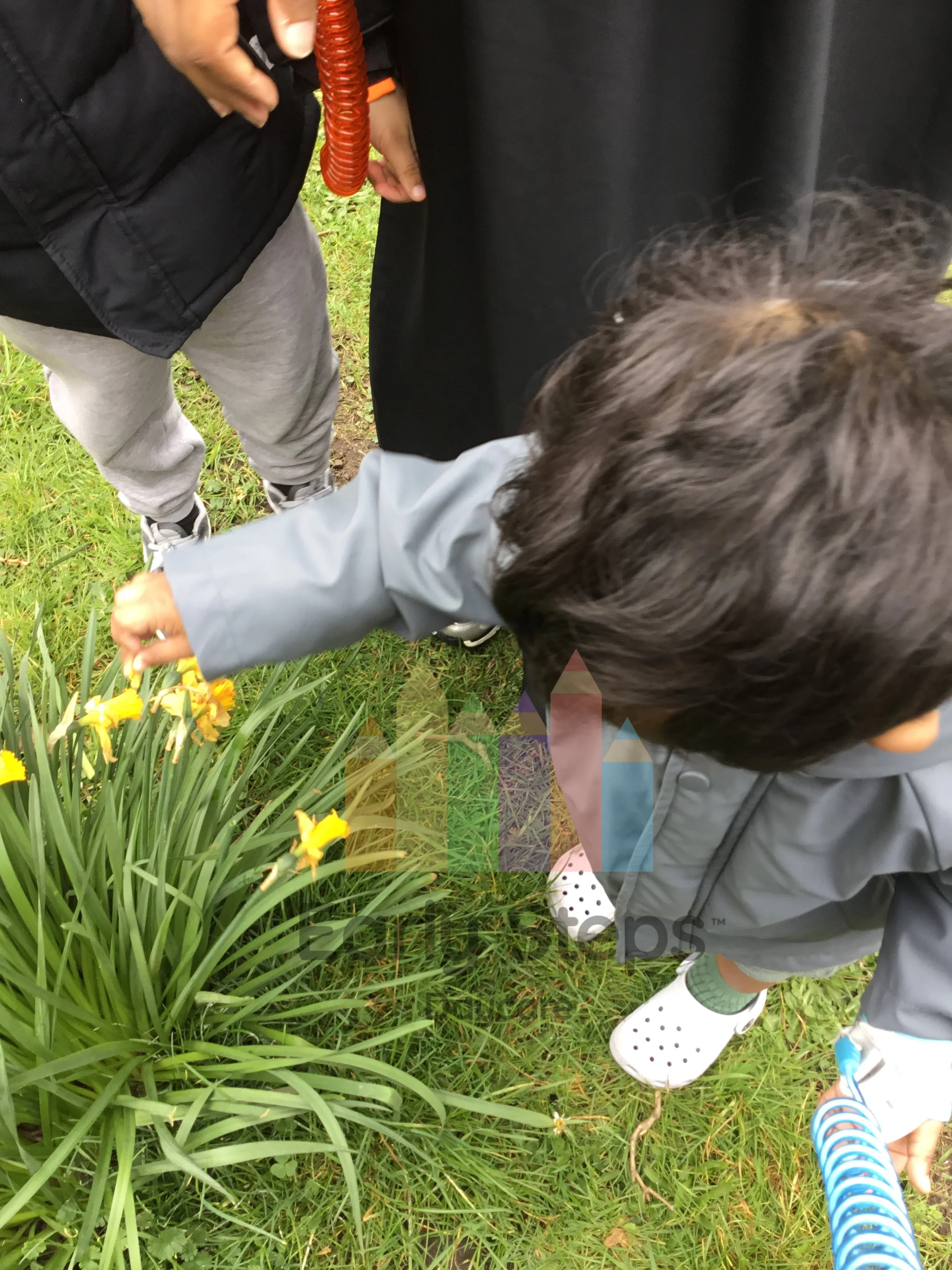 Children explore nature and seasonal changes while picking daffodils at the local park, enhancing their Understanding the World skills.