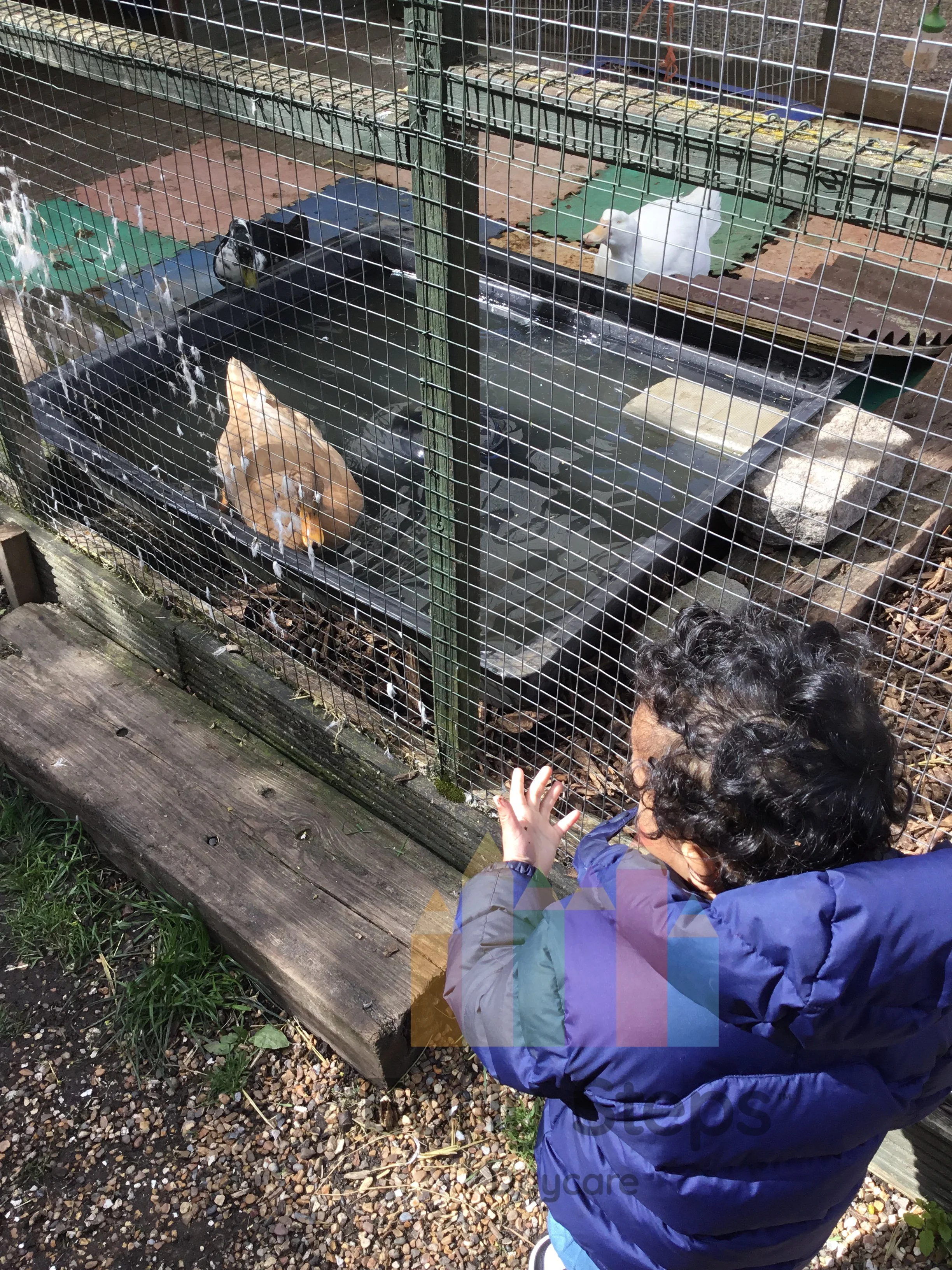 Child observes ducks at a local farm, exploring animals, habitats, and nature, supporting Understanding the World skills.